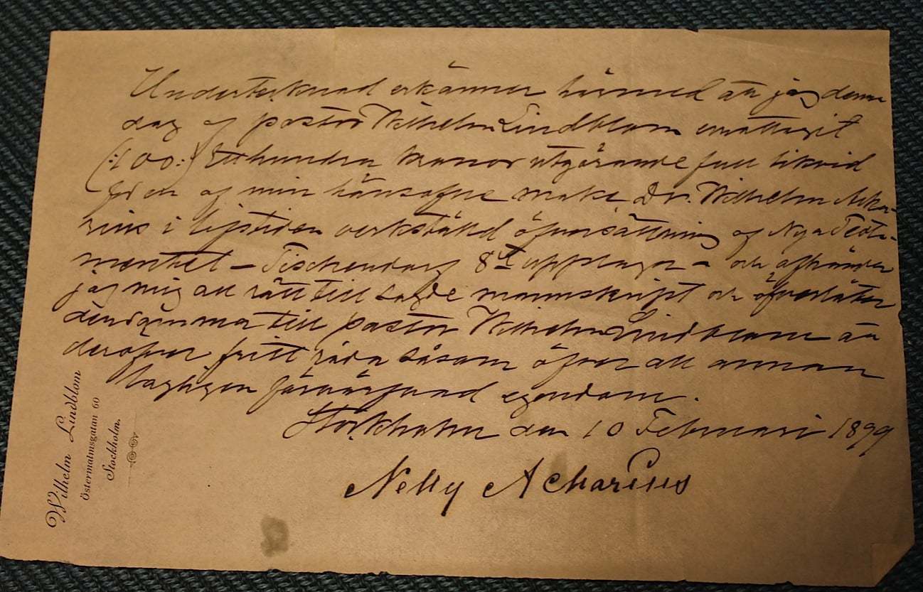 Extra intressant är att köpebrevet finns bevarat. I brevet skriver änkan Nelly ”Undertecknad erkänner härmed att jag denna dag af pastor Wilhelm Lindblom emottagit (:100:) kronor utgörande full likvid för en af min hänsofne make Dr Wilhelm Acharius i lifstid verkställd öfversättning av Nya Testamentet”. Brevet är daterat 1899 och hundra kronor var mycket pengar på den tiden. Wilhelm Lindblom var pastor i Stockholms första baptistförsamling. Med finns också ett gåvobrev där han skänker boken till Baptistsamfundets pastorsseminarium. Ett unikt fynd av en handskriven översättning av Nya Testamentet fanns i vår källare.