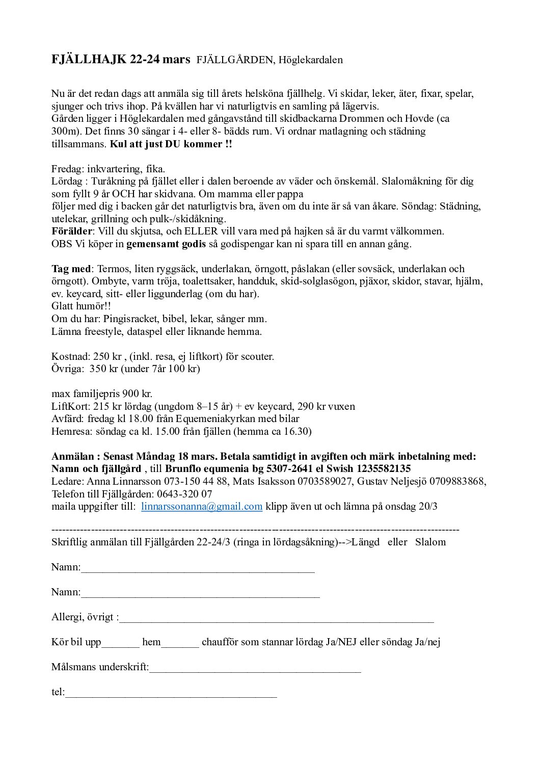 1 evenemang,![]() ![]() Fjällhelg för scouter och ungdomar och alla som vill få en skön helg tillsammans. Vi bor och hjälps åt med praktiska saker på vår fina Fjällgård i höglekardalen. Kostnad: 250 kr , (inkl. resa, ej liftkort) för scouter. Övriga: 350 kr (under 7år 100 kr) max familjepris 900 kr. Info och anmälan till Anna Linnarsson […] |