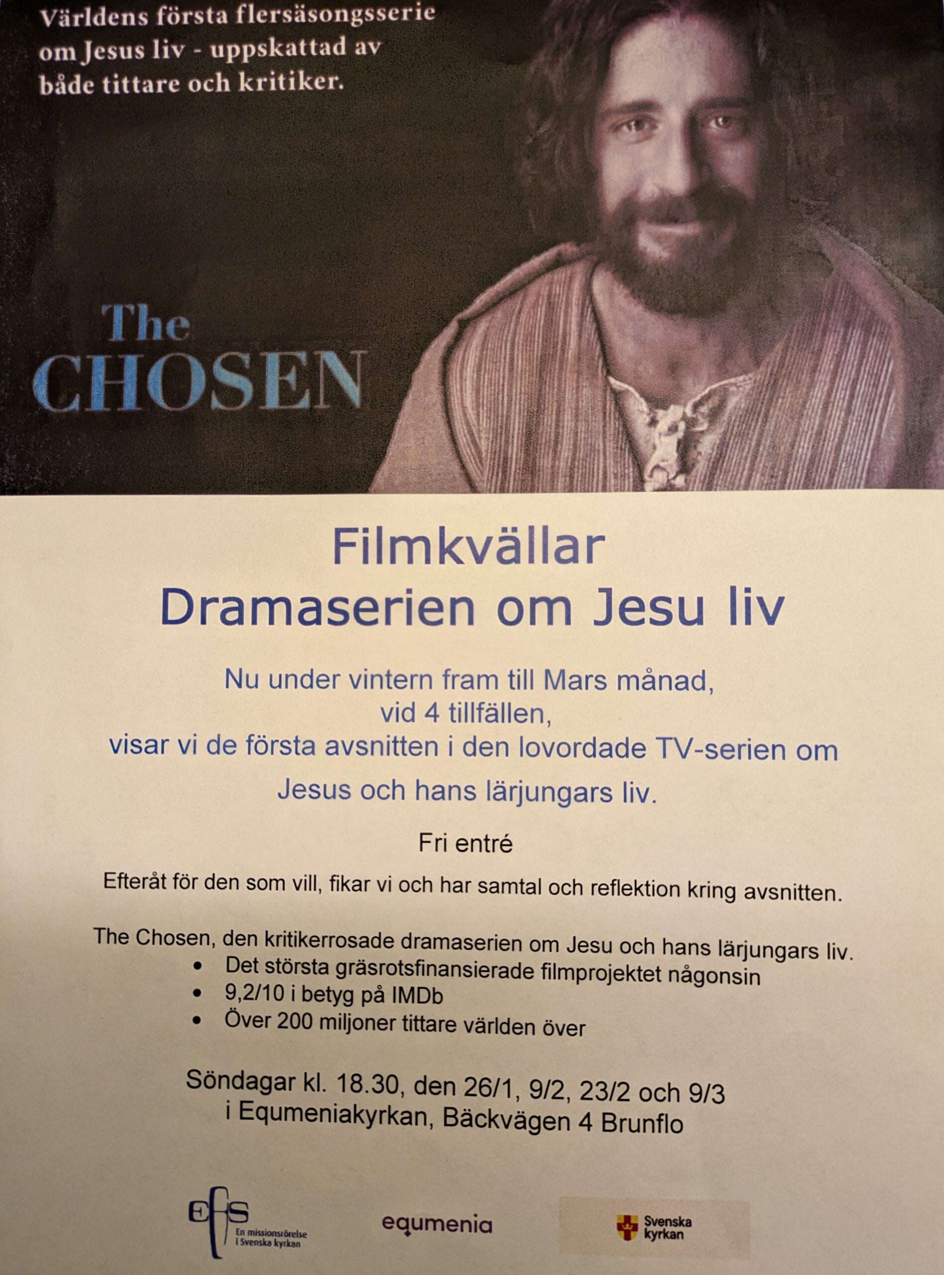1 evenemang,![]() ![]() The Chosen- Dramaserie om Jesu liv och hans lärjungar. Under våren vid 4 tillfällen kommer vi visa några av avsnitten från The Chosen. Första tillfället är Söndag kväll 26/1. Gratis entre Fika På slutet av kvällen för den som vill, fikar vi och har samtal och reflektion om avsnitten. Välkommen! |