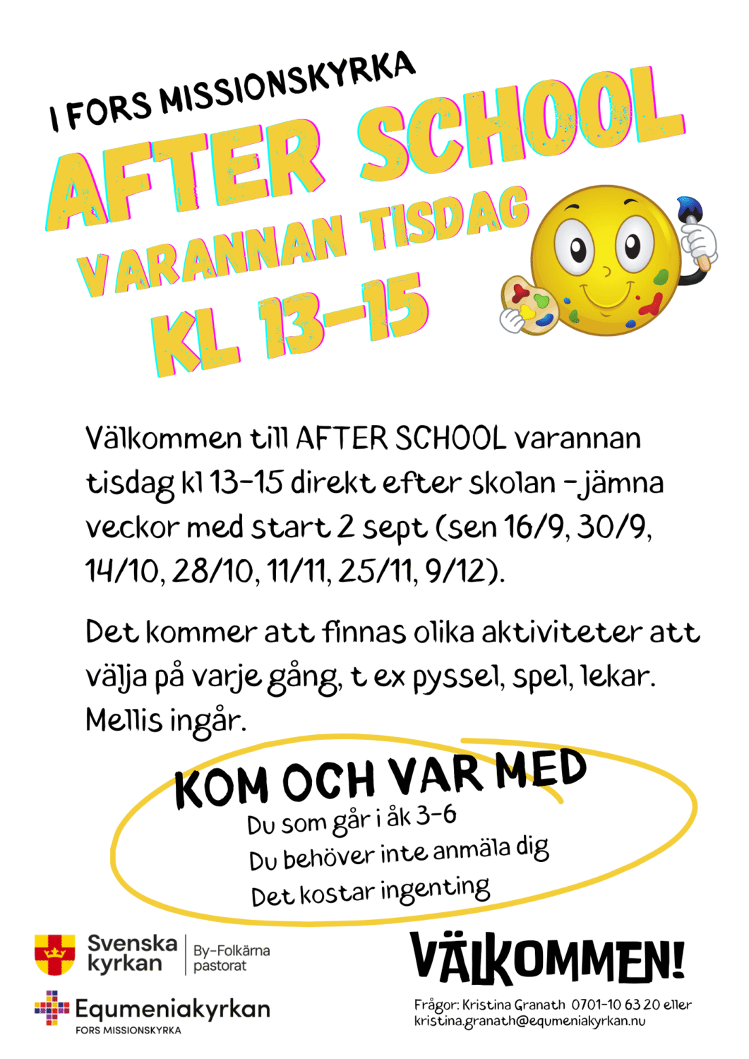 På tisdag kl 13-15, den 2 september, är alla barn som går i åk 3-6 välkomna på After School i Fors Missionskyrka. Vi och By-Folkärna pastorat driver detta tillsammans och det gör att vi kan vara många vuxna på plats. Vi har roligt och det brukar barnen också ha.