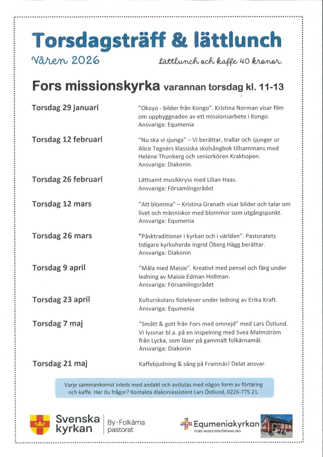 Nu startar vi igång torsdagsträffarna igen och alla som är lediga på dagen på torsdagar är varmt välkomna med. Vi träffas varannan vecka kl 11-13. Vi har olika program varje gång och äter soppa eller något lätt till självkostnadspris.