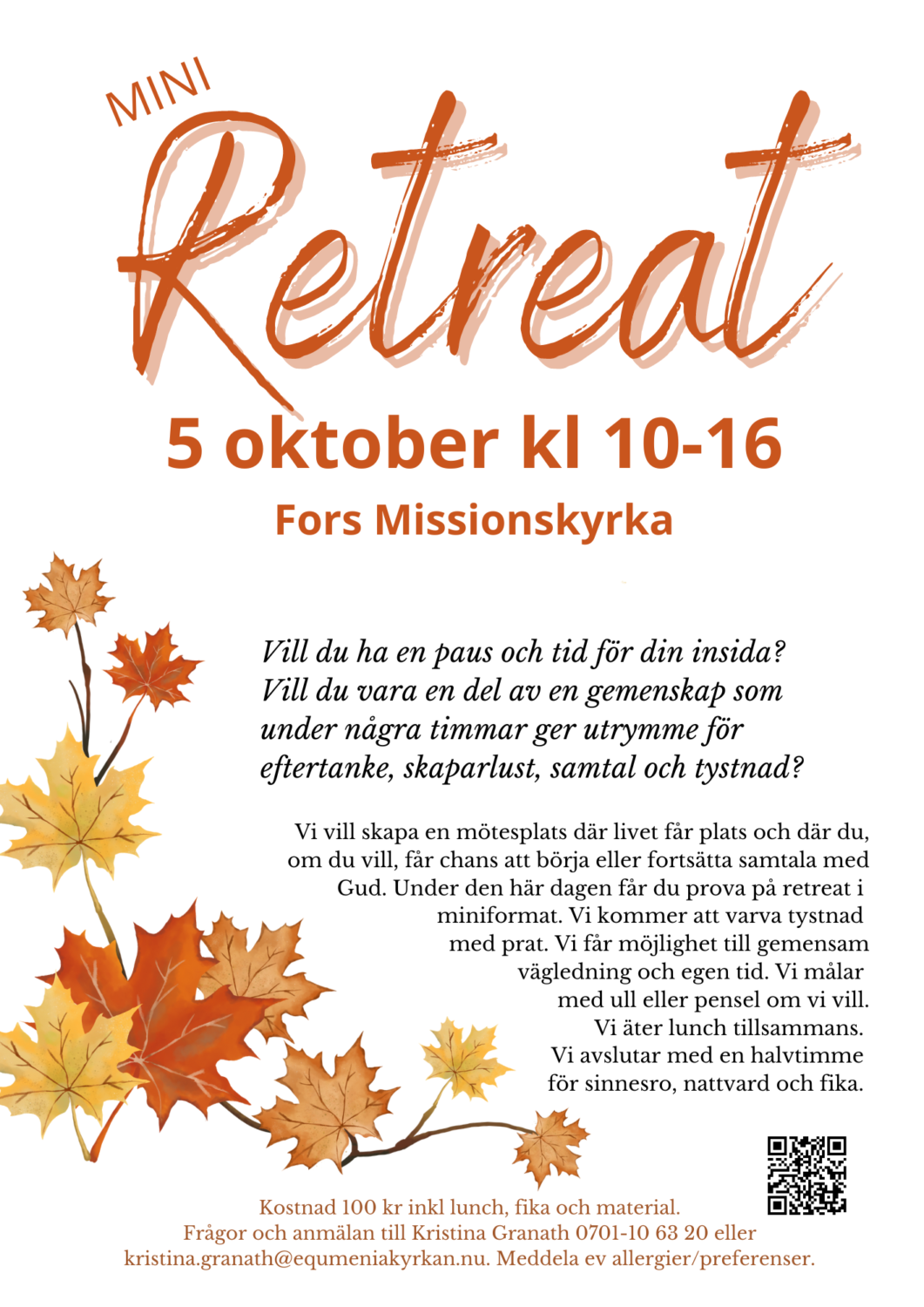 Frågor och anmälan till Kristina Granath 0701-10 63 20 eller kristina.granath@equmeniakyrkan.nu. Meddela ev allergier/preferenser.