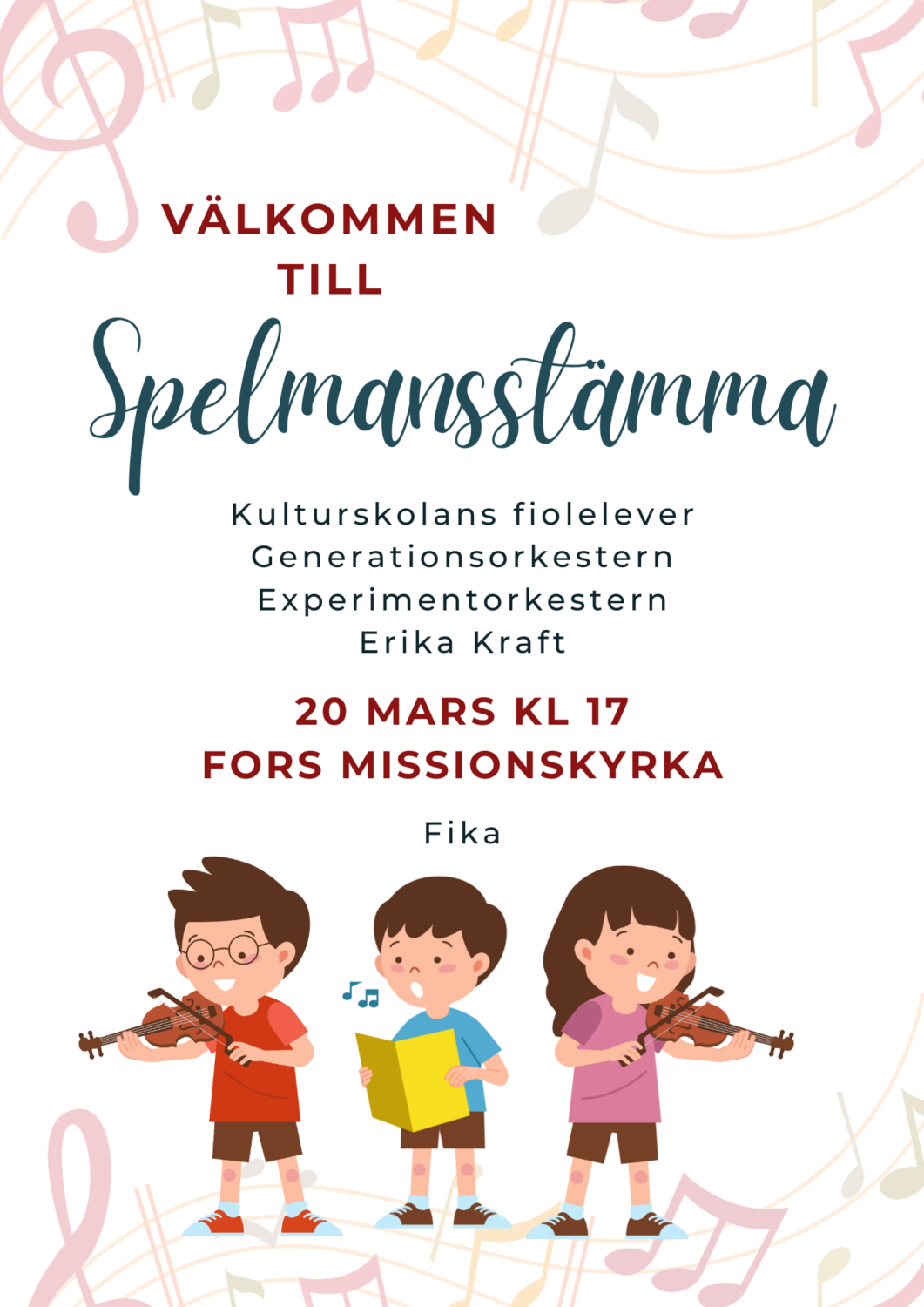 Varmt välkommen till spelmansstämma med Kulturskolans fiolelever, Generationsorkestern och Experimentorkestern under ledning av Erika Kraft. Spelmansstämman är i Fors Missionskyrka och det bjuds på fika. Ingen entré, men det ges möjlighet att ge en gåva till After School-verksamheten