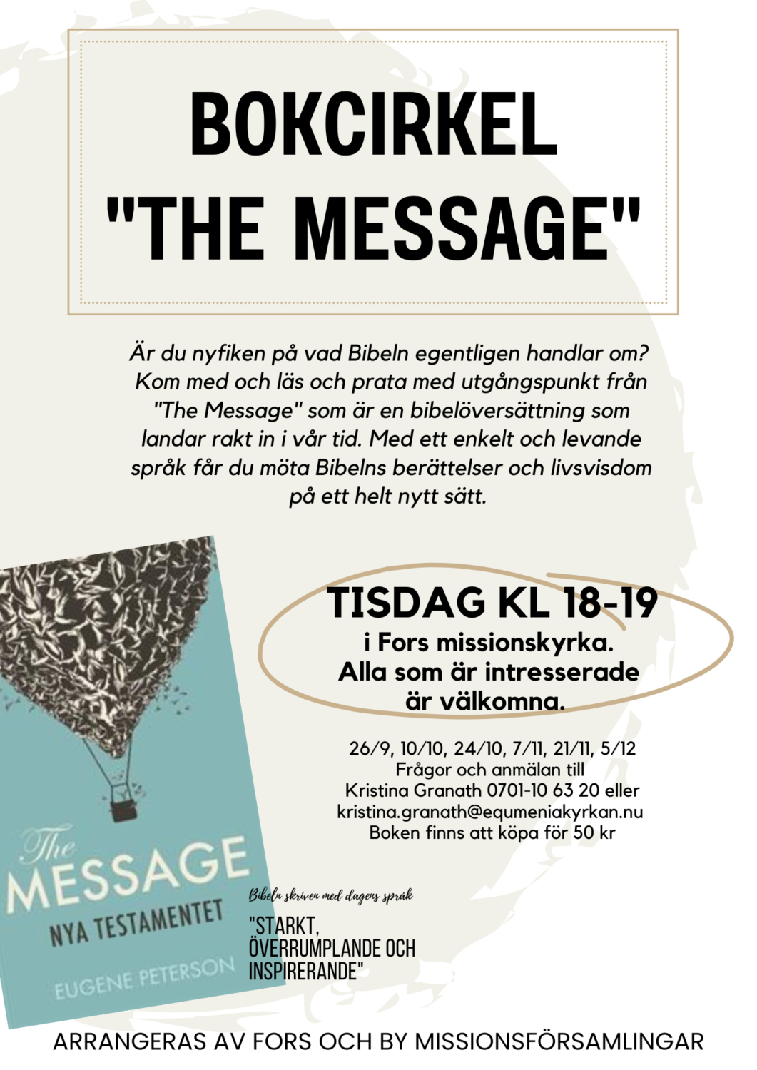Är du nyfiken på vad Bibeln egentligen handlar om? Kom med och läs och prata med utgångspunkt från ”The Message” som är en bibelöversättning som landar rakt in i vår tid. Med ett enkelt och levande språk får du möta Bibelns berättelser och livsvisdom på ett helt nytt sätt.