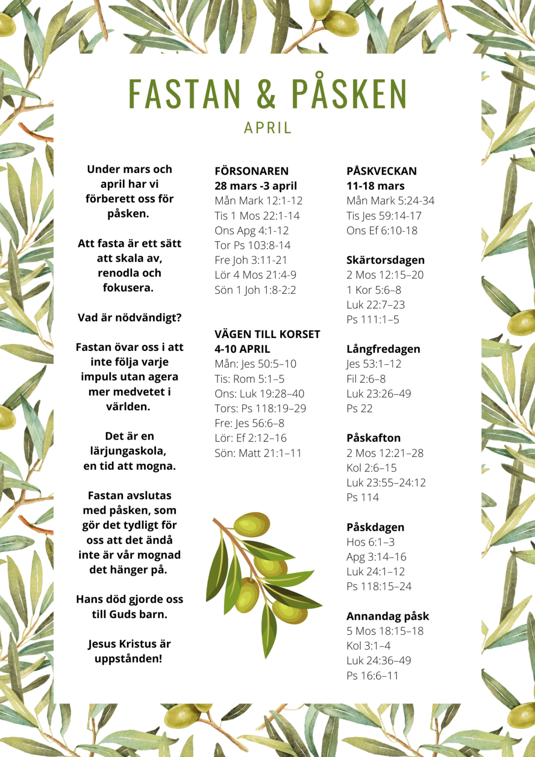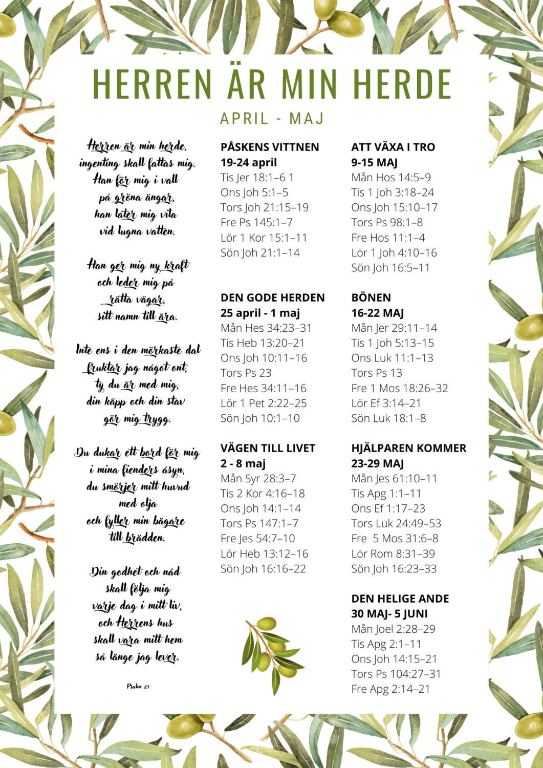 Alla som vill läser Bibeln hemma utifrån vår gemensamma bibelläsningsplan. När vi har gudstjänst och andra samlingar utgår vi från veckans texter och tema. Välkommen med!