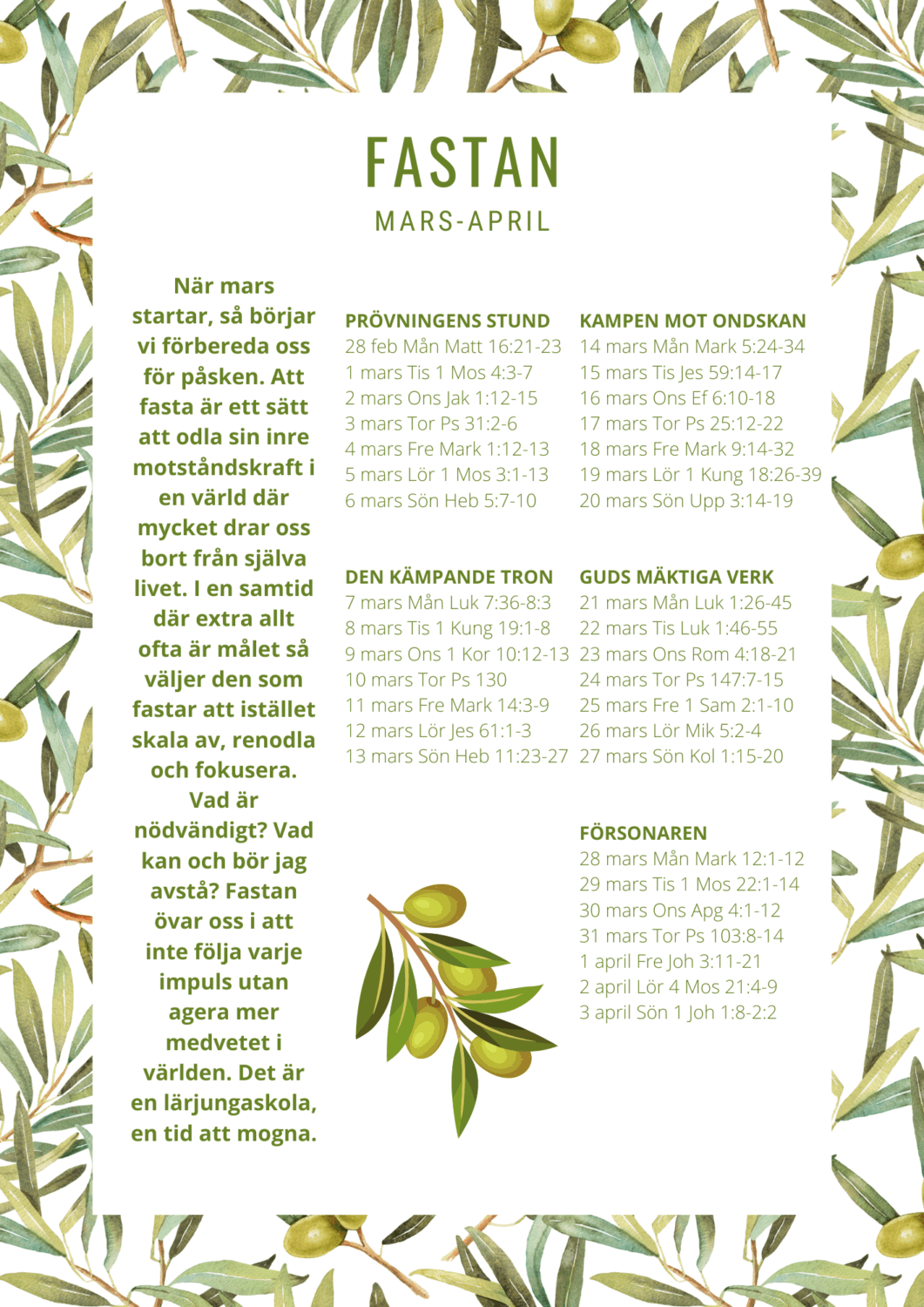 Under fastetiden läser vi de gemensamma fastetexterna enligt kyrkoåret. Texterna används i gudstjänsterna och under våra samlingar för Bibel och bön.