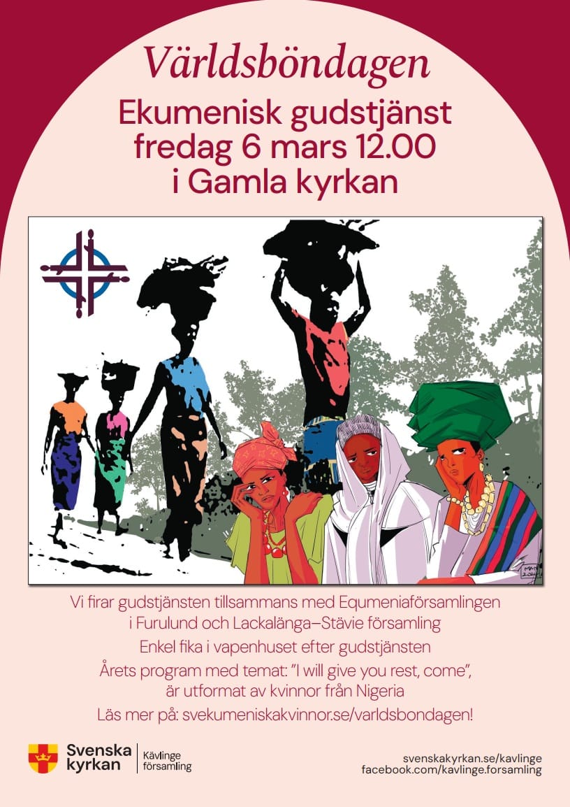 Församlingen Världsböndagen Publicerat 2026-02-19 Vi firar ekumenisk gudstjänst tillsammans med Kävlinge och Lackalänga-Stävie församlingar. I år står Kävlinge som värd. Läs vidare
