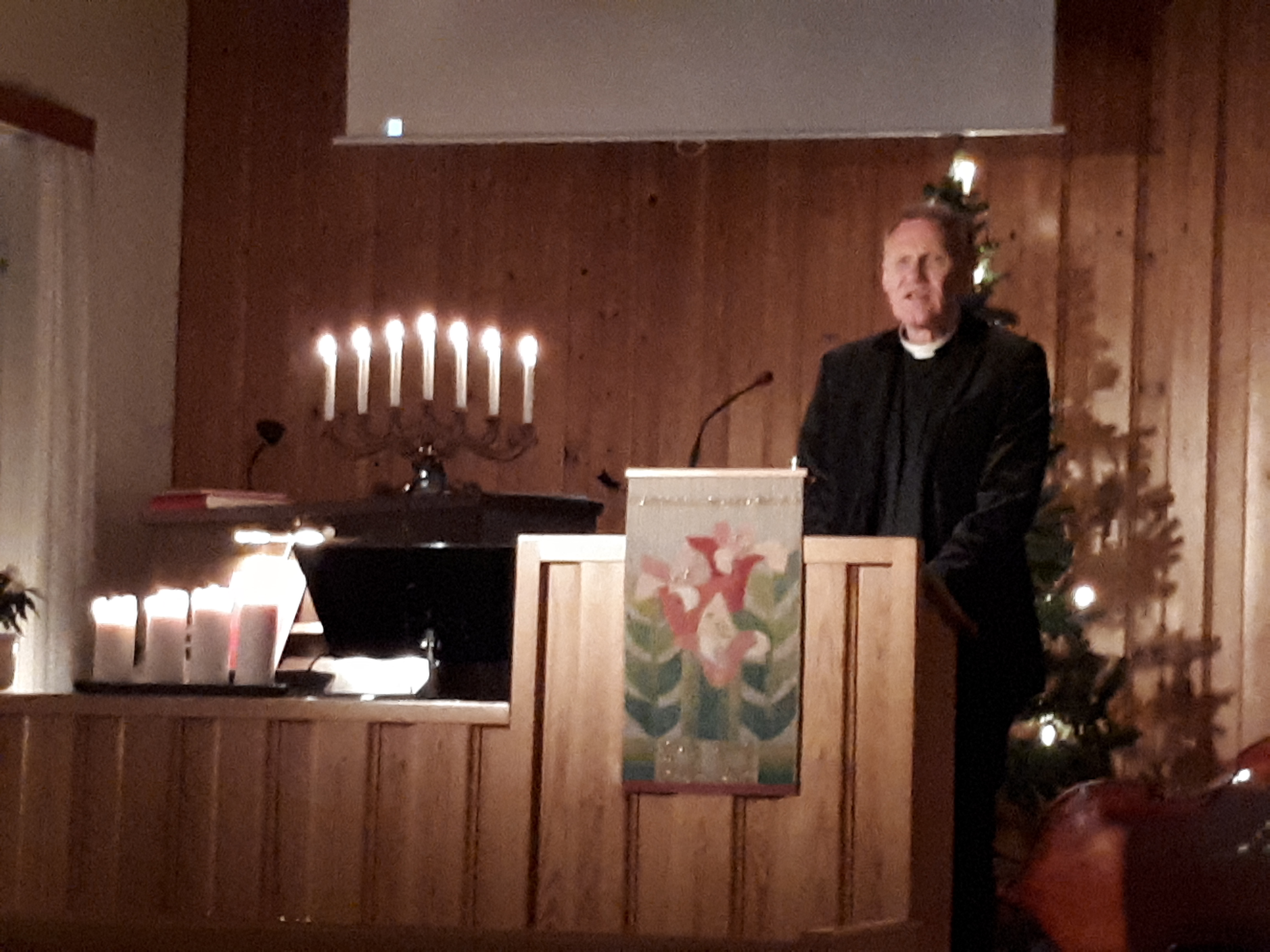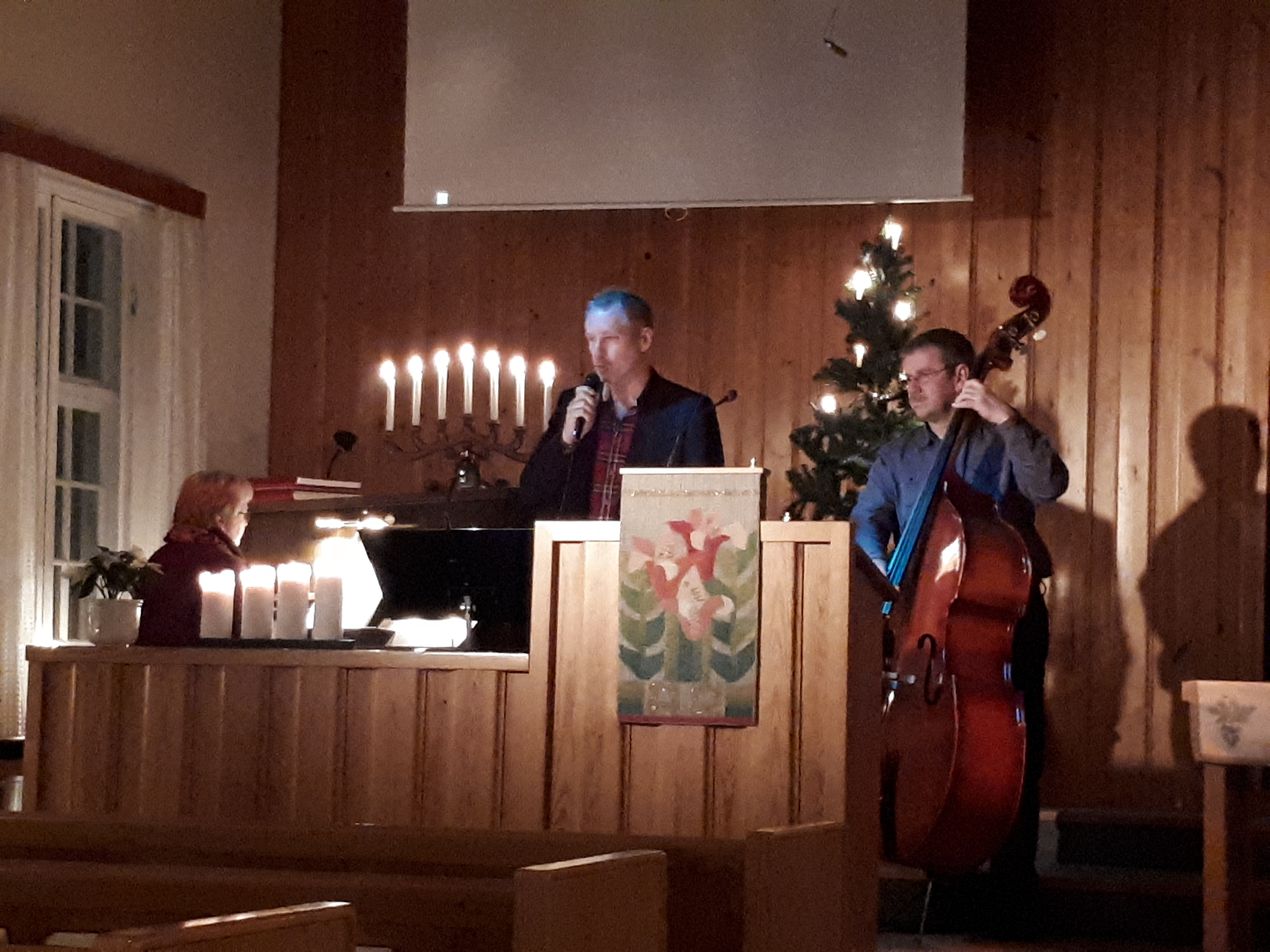 Utanför Equmeniakyrkan var marschallerna tända och inne i kyrkan brann många levande ljus som hälsade besökarna välkomna. Julstämning och förväntan låg i luften. Julottan inleddes med att vi hälsades välkomna av pastor Eddy Alexandersson innan församlingen sjöng ”När juldagsmorgon glimmar”. Därefter fick vi lyssna till orgel och fiolmusik av Cajs-Marie Årlen och Olle Algesten, en stämningsfull upplevelse. Vidare fick vi lyssna till John-Anders ”Putte” Ålander, som framförde, I denna natt blev världen ny, Jul jul strålande jul, Stjärnan som lyser så klart och Mary did not know. Han ackompanjerades av Elisabeth ”Betta ”Arvidsson på piano och Ola Arvidsson på bas. Fler av de traditionella julsångerna som Stilla Natt och Nu tändas tusen juleljus sjöngs under julottan. Det hela avslutades med kyrkkaffe.