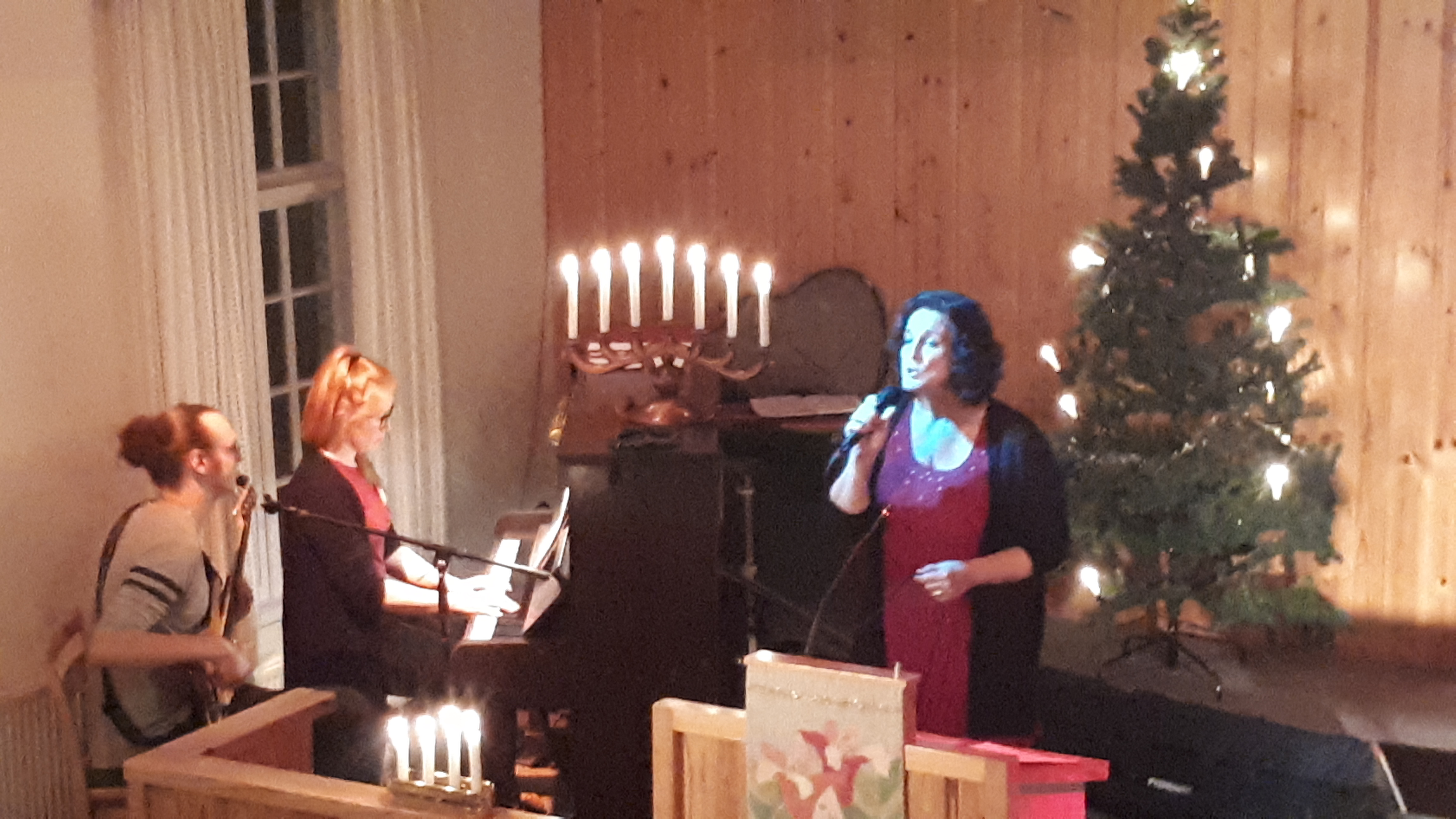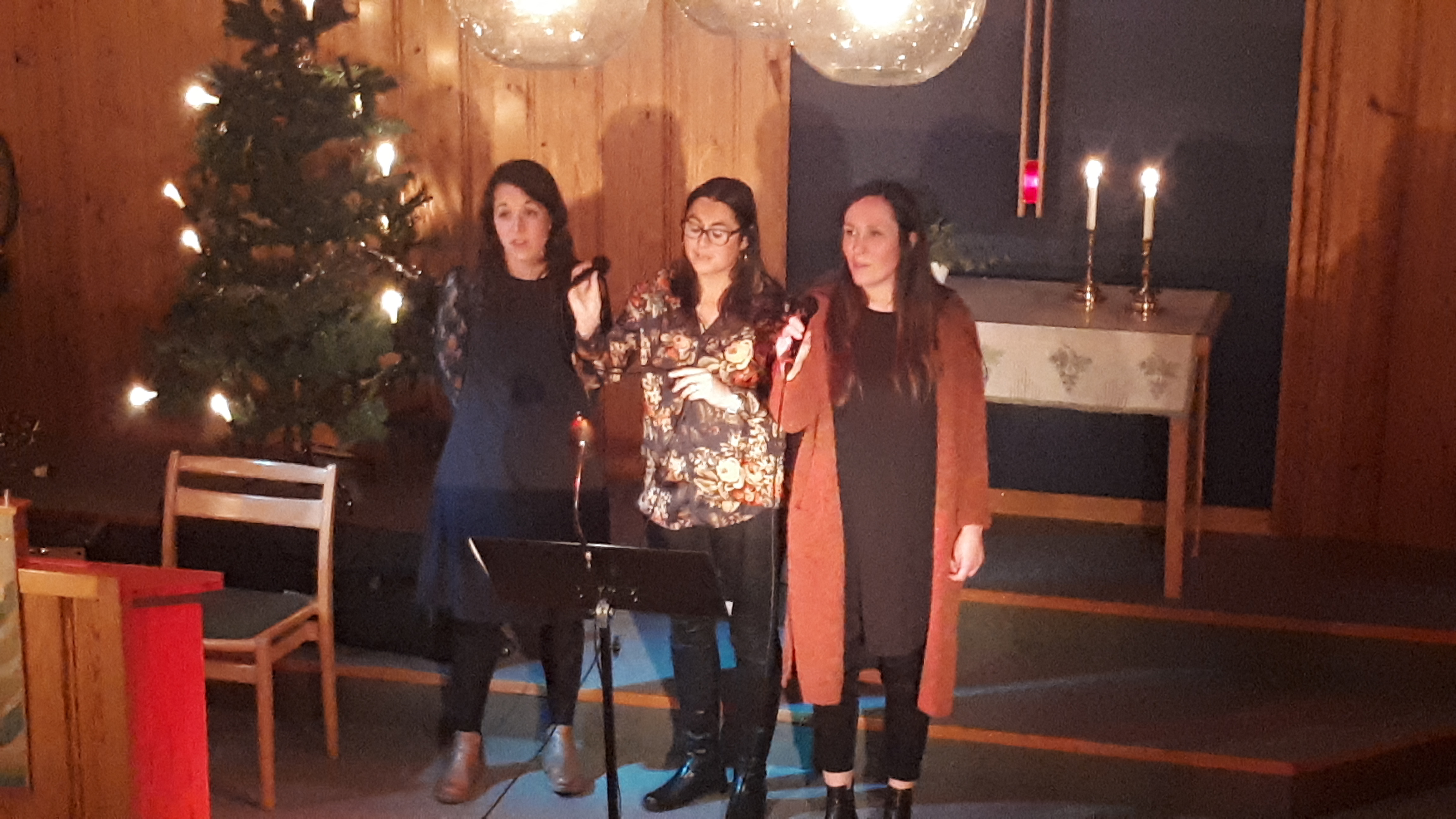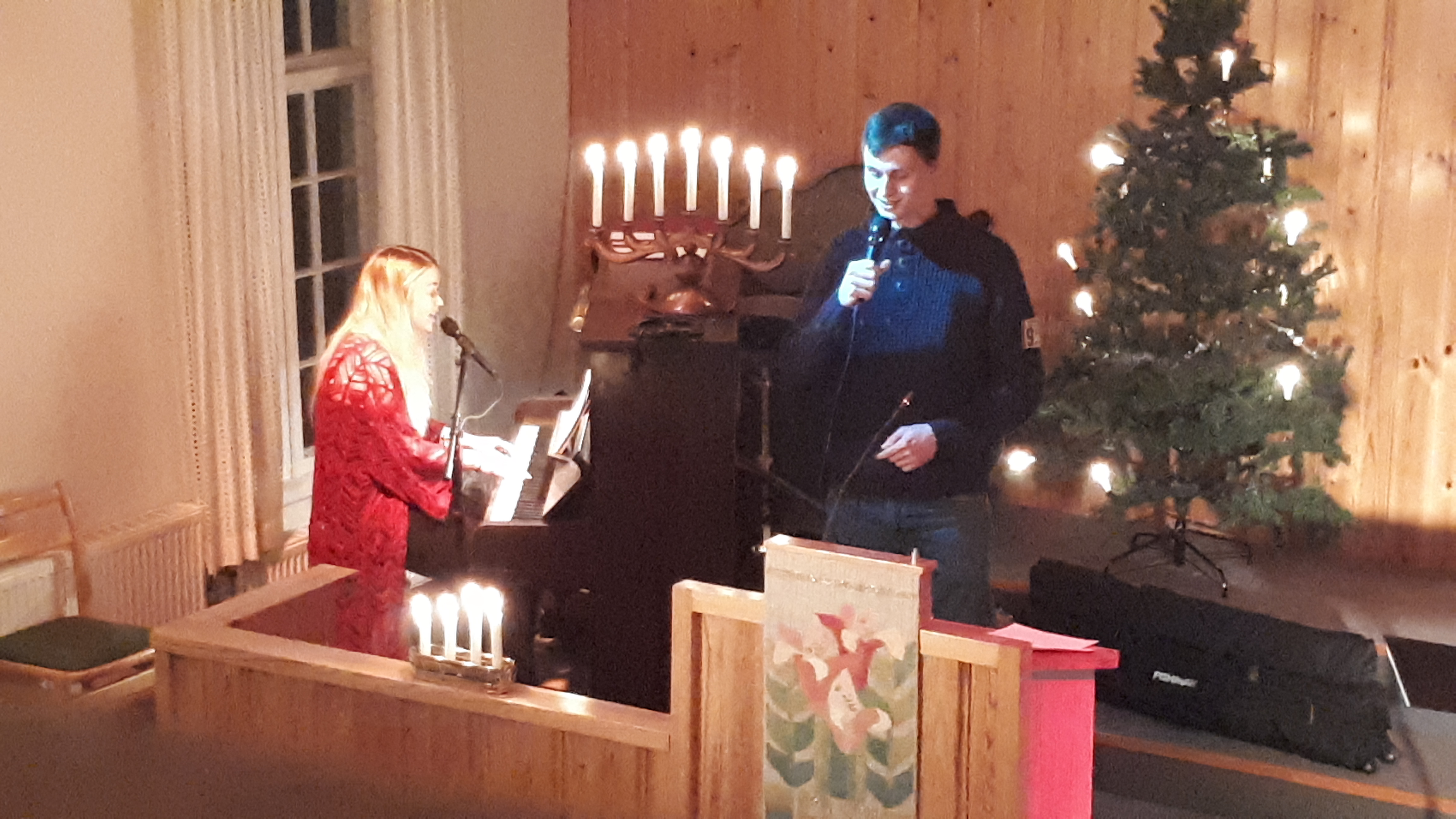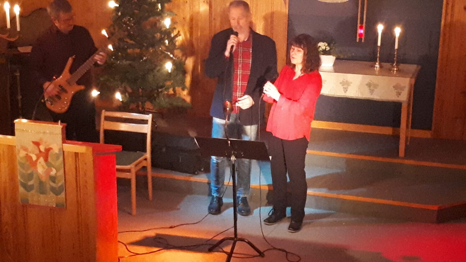 Många kom till Equmeniakyrkan på lördagskvällen den 21 december för att lyssna till julens sånger. Det började med att sången Dagen är kommen spelades på trumpet från läktaren av Andreas. Därefter bjöd Selma och Noel, med stöd av föräldrarna och Camilla, på Nu tändas tusen juleljus. Erica, Elin och Camilla fortsatte med sången En stjärna lyser så klar. Vi fick lyssna till Mary did you know och Viska en bön, som framfördes av Putte och Agneta. Elisabeth gav oss White Christmas och Christmas song. Eddy berättade kring julevangeliet, kärnan i julfirandet. Olle sjöng Giv mig ej glans och Det strålar en stjärna. Angelica och Adam fortsatte med Auld lange syne och Jul, jul, strålande jul. Återigen ljöd Andreas trumpet och vi fick lyssna till Stilla Natt. Som avslutning på samlingen sjöng vi gemensamt Fröjdas vart sinne, julen är inne.