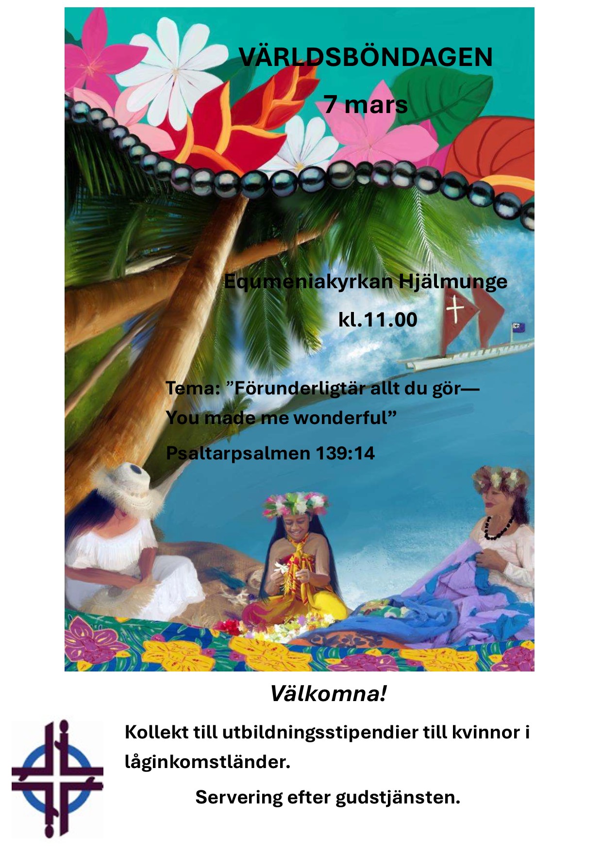 Kvinnor på Cookoöarna har förberett en gudstjänst som vi firar kl.11.00 fredagen den 7 mars. Arrangör Equmeniakyrkan och Svenska kyrkan.
