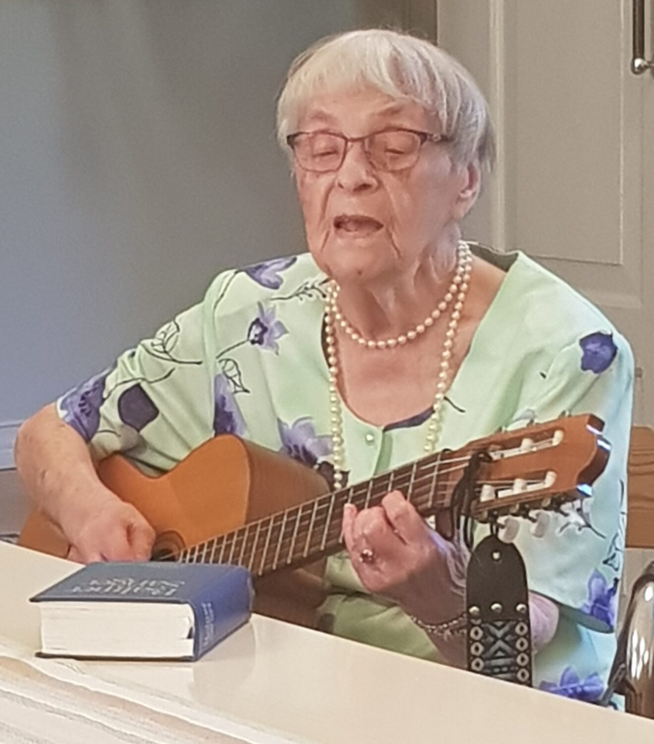 En mycket varm tisdag kväll i slutet av juni samlades en grupp människor för att dela Gudsgemenskapen, ordet, sången och bönen tillsammans. Gudstjänsten inleddes med sommarpsalmen ”O vad jorden nu är skön”. Cecilia Strömberg som ansvarade för gudstjänsten läste den gångna söndagens psaltarpsalm, Psaltaren 96. Därefter sjöng Cecilia ”Härligt att går i midsommartid”. Nyåkersprästen Ulf Gustafsson fick bidra med en betraktelse införd i ”Vårt budskap”. ”Att vara välsignad” Den talade om att plantera ett träd, hur viktig rötterna och vattnet är för att det ska växa och vad som är viktigt i våra liv för att vi ska växa. Gunborg Hörnström 96 år sjöng en solosång om Noa, en sång med massor av verser som framfördes utan noter och med hennes gitarrkomp.