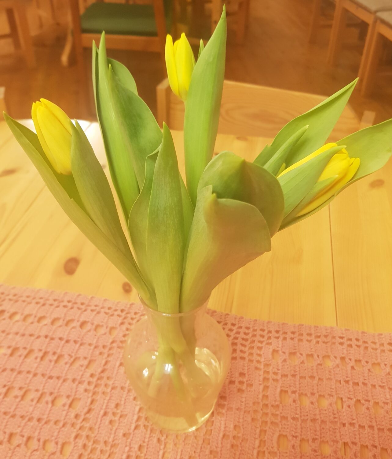 Kvällens missionsafton inleddes med psalmen ”Kristus är världens ljus”. Eiron Flogér var inbjudare och borden och altaret var prydda med tulpaner.