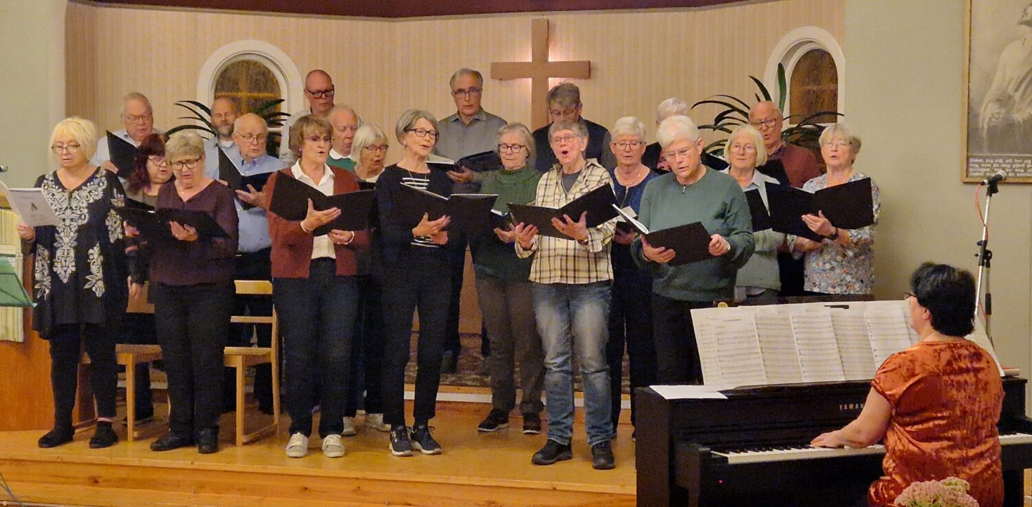 Deras sångprogram inleddes med ”Halleluja lova Gud”. Därefter sjöngs ”Visa i Backa” en visa som sjöngs på nå-nå. Kören fortsatte med ”Se på din värld”, ”Hosianna”, ”Herre du som från det höga” och ”Morgon och afton”. Kvällens talare uteblev så vi fick ta plan B. Cecilia Strömberg läste en betraktelse skriven av Britta Bolmenäs i tidningen ”Sändaren”. Den handlade om vägskyltar på livets väg och utgick från Bergspredikan i Matteus 5-7. Britta har varit pastor nu senast i Värnamo missionskyrka och är nu chef för Equmeniakyrkans nationella enhet. Därefter fortsatte kören med ”Min plats på jorden” och ”Må din väg gå dig till mötes”. Cecilia tackade kören och avslutade med bön. Kvällspsalmen ”Innan natten kommer” sjöngs och därefter ”Välsignelsen” Kvällen avslutade med fikagemenskap där Iris dukat upp så att alla kunde bre sina mackor och ta en kaka.