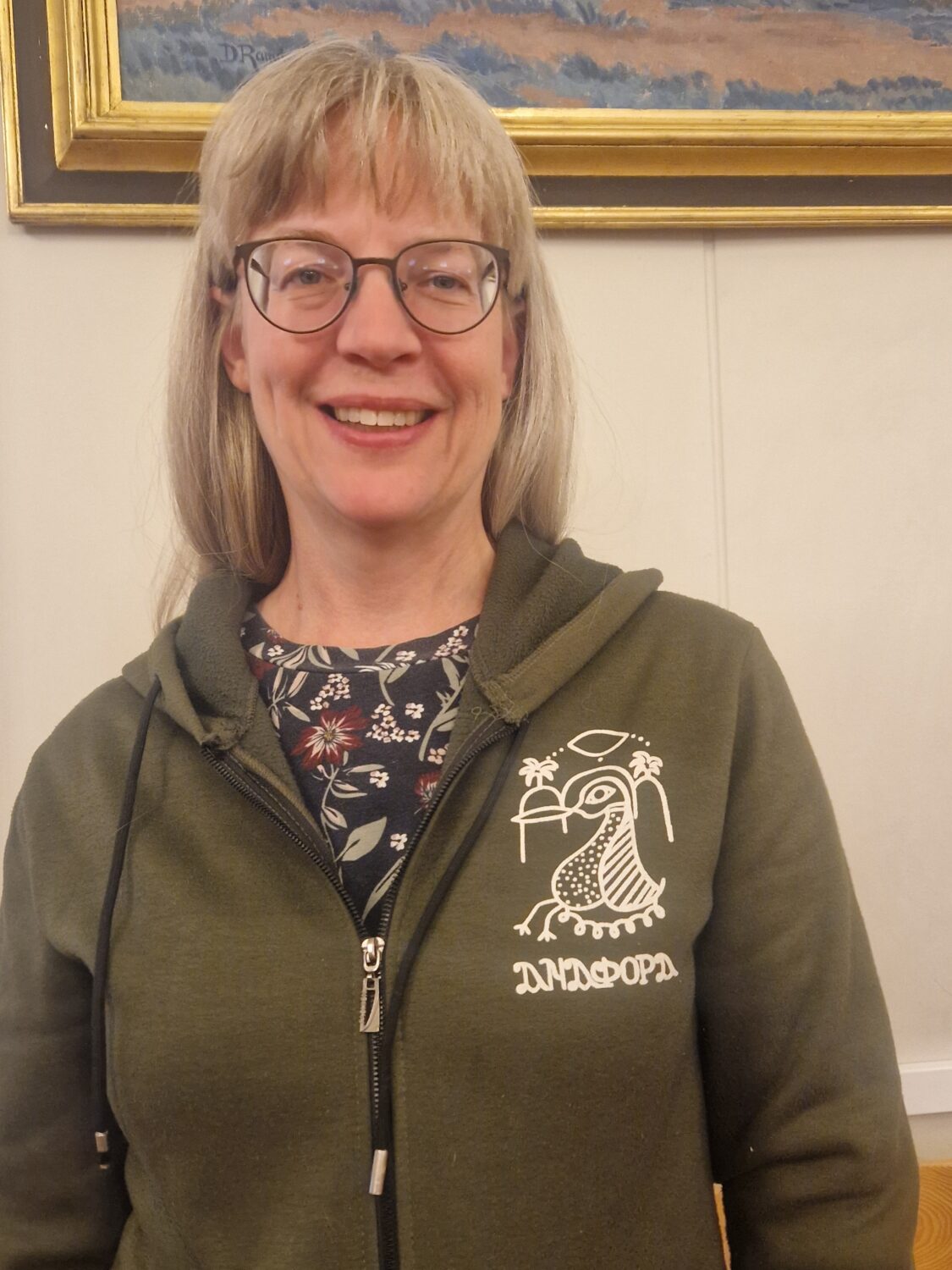 Tröjan som hon hade på sig köpte hon där i Anafora. Lite annorlunda bokstäver eftersom de pratar arabiska i Egypten men i Anafora finns en koptisk ortodox kyrka och där pratar man koptiska. Det liknar mycket grekiska språket. Anafora ligger i öknen utanför Kairo. Tre områden inom området. Det är ett stort inhägnat område utanför vägen med vakter och poliser utanför. Det känns tryggt att vara bevakad. Biskop Tomas har ordnat det här stället där det bor 23 systrar, 2 präster och 1 diakon + en massa volontärer från Sverige, Tyskland, Sydafrika och Egypten. En kvinna med sina söner från Tyskland bosatte sig där. Anna städade, diskade, vävde trasmattor, odlade svamp. Det hände massor av saker som hon inte trodde hon skulle göra. Som att tvätta över 100 mattor. De täcker hela golven i kyrkorna.. att koka 20 kg dadlar, det är sånt som händer i Anafora. Anna har fått nya släktingar. En som var släkt med hennes pappa. Hon har fått en systerdotter fast hon inte har någon syster. Det var en som kallade henne för moster. En tjej ville också vara dotter till Anna. Man känner att det är en bedjande församling. Hon visade några bilder, uppståndelsekyrkan som är en stor kyrka. En kvinna från Finland som hette Helena som har gjort många målningar i 12 år. Nu har hon också börjat måla utvändigt. Man kan skriva dit och be att få komma. Direktflyg från Stockholm för ca 5-6000 kr. Om man ska vara volontär så kan man få hämtning. Man betalar efter förmåga. Det är inget krav att man ska betala för sin vistelse. Det finns små hus och längor med rum. Jättebra mat, vegetarisk mat. Just nu är det väldigt varmt, över 40 °. I december var det väldigt kallt trots sovsäck och filtar som Anna tagit med sig. Februari-mars eller september-oktober är bra tidpunkt. De pratar arabiska. Få människor kan lite engelska men kroppsspråk fungerar också. Tideböner – kl. 4 på morgon, kl. 7. Sedan jobbar de hela dagen. Kl. 17 och kl. 20 är det också bön. Trasmattorna var vävda i olika färger. Symboliserar att vi alla är olika.