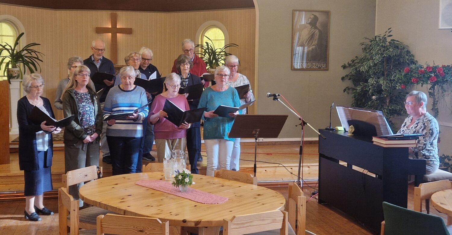 Efter Annas berättelse sjöng kören ”En skapares händer” och ”Vårens stilla väntan”. Siv Eriksson läst en dikt av Atle Burman, ”En sommarpsalm”. Därefter sjöng kören tillsammans med församlingen sommarpsalmen ”Över berg och dal”. Körens sista sång blev ” Sommarn’s dörr står nu på glänt”. Cecilia pålyste sommarens gudstjänster och bad för veckans böneämnen och lapparna som finns i vår böneskål. Som avslutning sjöngs psalmen ”Jag vill ge dig o Herre min lovsång” och ”Välsignelsen”. Efter mötet fick alla samlas runt fikabordet.