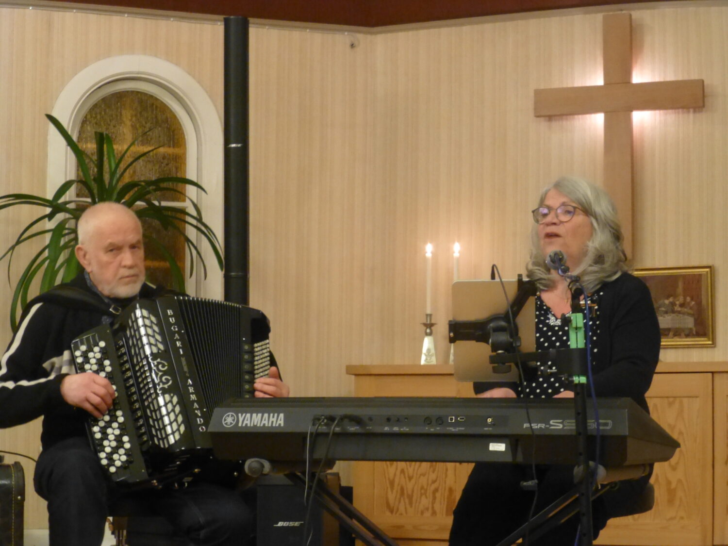 Sture började sin predikan med att ställa fråga: Hur når vi ut med budskapet till människor? Hur får vi människor att komma och lyssna. Matteus 28:19 Gå för den skull ut och gör alla folk till lärjungar… Visst brådskar det. Det finns något som kallas domedagsklockan För några år tillbaka sa man att den låg på fem i tolv. Nu säger man 85 sek tills det är slut. Det är ingen kristen domedagsklocka utan en helt profan. Sture läste i en bok: Huvudet är varken ihåligt eller tomt, det har ett hårt påskruvat lock. Man kan inte hälla in åsikter. Det öppnas bara när ägaren vill det. När det sker, sker en filtrering genom många lager av erfarenheter, åsikter, inlärda saker, rädsla, fördomar och misstänksamhet. Om åsikter ska hitta vägen in beror mycket på återkopplingen mellan talaren och lyssnaren. När det gäller evangelisation har vi ett stort föredöme i bibeln i form av Paulus. Han sa i 1 Kor 9:20: ”För judarna har jag blivit som en jude för att vinna judar. För dem som är under lagen har jag blivit som de som är under lagen fast jag inte själv är under lagen….” Vi tror att vi måste vara starka och duktiga för att nå människor men det är många gånger så att våga visa sin svaghet, sina misstag är en styrka för då får människor någon de kan lita på, som vågar visa sina svagheter. Vad ska vi tala om? Den framtid som vi ser nu är något som går att tala om. Det som nu händer i Iran är något som griper tag i de flesta människor och får dem till att bli ganska ödmjuka. Vi sitter på scenen för världens absolut största händelse, avslutningen för den här tidsåldern. Många av oss äldre har sett Israel födas. Det tog 2000 år men det är ett av de stora tidstecknen att Israel har fått sitt namn igen. Bibeln talar om att vara beredd. Om de tio jungfrurna som väntade på att bröllopet skulle ske. När det var dags var det fem som inte hade olja i sina lampor så de kunde inte följa med. Vi må väl inte vara dessa fem som inte har olja i våra lampor. Det är viktigt att vi har ett kristenliv som fungerar, att vi är beredda. Efter det här kriget återstår ett stort krig när alla stater runt Israel gaddar ihop sig, Ryssland norrifrån, Kina österifrån och angriper. Men då finns det något som händer. Jesus kliver ner på Oljeberget och säger att nu är det nog. Då kommer domens dag. Är vi beredda för det? Eller låter vi vardagslivet bara flyta på och vi tar inte det här på det riktiga allvaret. Var och en av oss får ställa sig frågan: Hur allvarligt ser jag på det här? Hur noga tycker jag att det är att mitt kristenliv fungerar, ett böneliv som fungerar, en relation med Gud som gör att jag vet var jag hamnar när det är dags. Ibland tänker Sture att Margot har ett glädjens budskap och Sture har det allvarliga. Båda behövs på något vis. Livet är inte bara allvarligt. Det växlar hela tiden som årstiderna. Ibland är det sommar och varmt och ibland är det kallt. Ta det här budskapet på allvar. Låt det sjunka in. Vi har alla en uppgift att möta våra medmänniskor och kunna berätta om att det finns en Gud som har nåd och kärlek till var och en.
