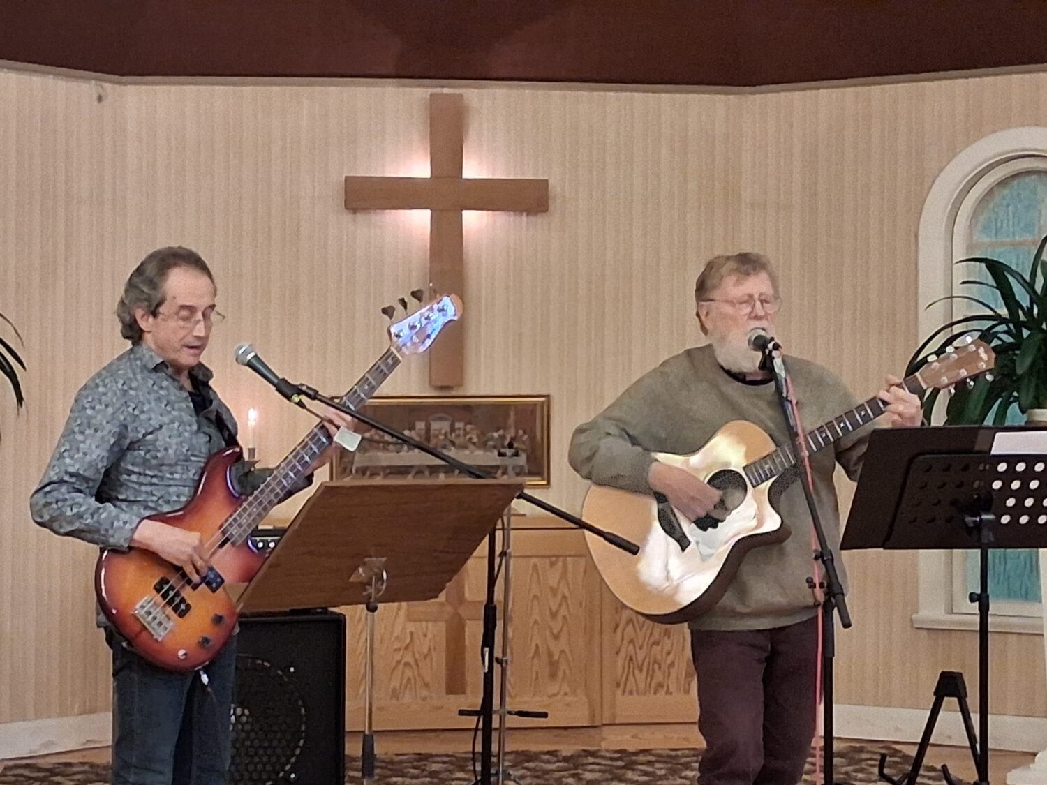 Kjell började med att nämna om den här tiden på kyrkoåret som är den tid då vi tänker över vad Jesus gjorde på Golgata, hans död och uppståndelse. Vår tid är präglad av mycket besvär och mörker. Centrumkyrkan i Husum har en second hand i Ö-vik som samlar in mycket saker som körs över till föreningen ”Filippos”. Det är kläder, husgeråd som går vidare till Ukraina. Vad ska vi göra i sådana här tider. Det bästa vi kan göra är att samlas i Guds hus. Sedan ska vi naturligtvis hjälpa till på det sätt vi kan. Vi möts omkring Jesus och han vill röra vid oss var och en. Han vill röra med hela bygden. Gud hör våra böner. Vi kan läsa i bibeln att de heligas böner samlades i skålar och vändes ner mot jorden och det hände något. Vi behöver bli uppmuntrade och uppmuntra varandra. De började med sin signaturmelodi ”Prisa Gud”. De fortsatte med en sång som är hämtad från Psaltaren 46. ”Gud är vår tillflykt”. Det kanske inte ser ut som att Gud stillar strider. Vi människor är de som ställer till det. Men det är vår önskan att Gud ska stilla strider. Därefter sjöng de en nyskriven sång som berör skjutningar och sådant som händer runt omkring oss. Vi ropar till Gud och ber om en väckelsetid över Sverige. Nästa sång handlar om att en dag ska Jesus ska komma tillbaka. Han väntar för att han vill att alla ska omvända sig. Sången heter ”En dag kommer Jesus själv tillbaka”. De fortsatte sedan med en sång i samma tema, ”Lyft blicken upp mot Jesus”.