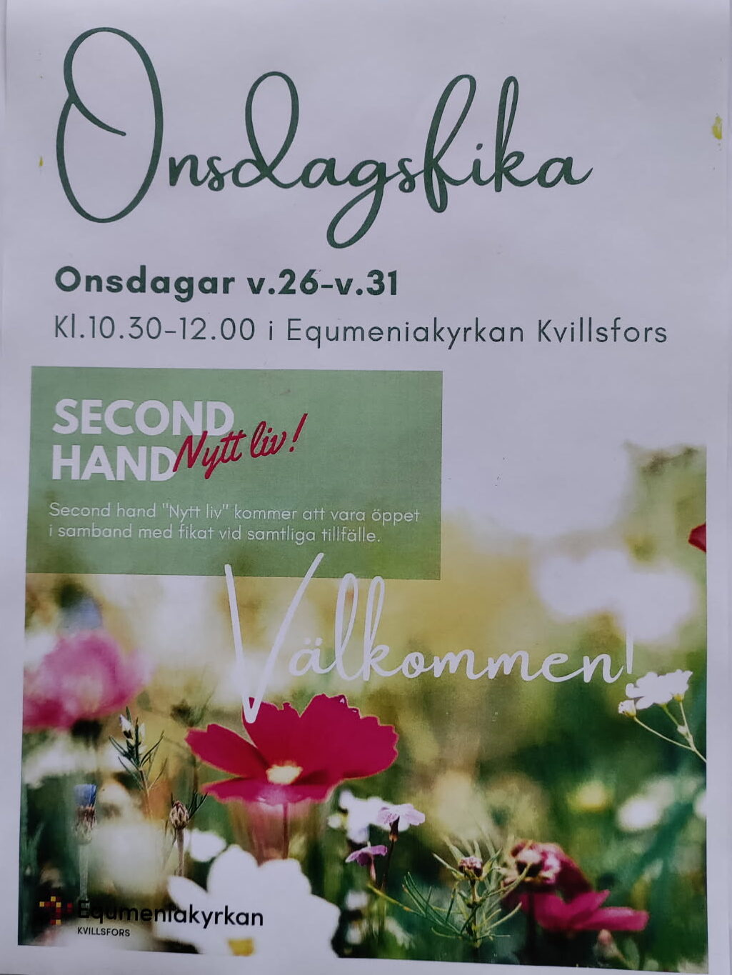 I sommar, v.26-31, är du varmt välkommen på onsdagsfika i Equmeniakyrkan mellan kl 10.30-12:00. Under tiden kommer också second hand ”Nytt liv” att vara öppen.