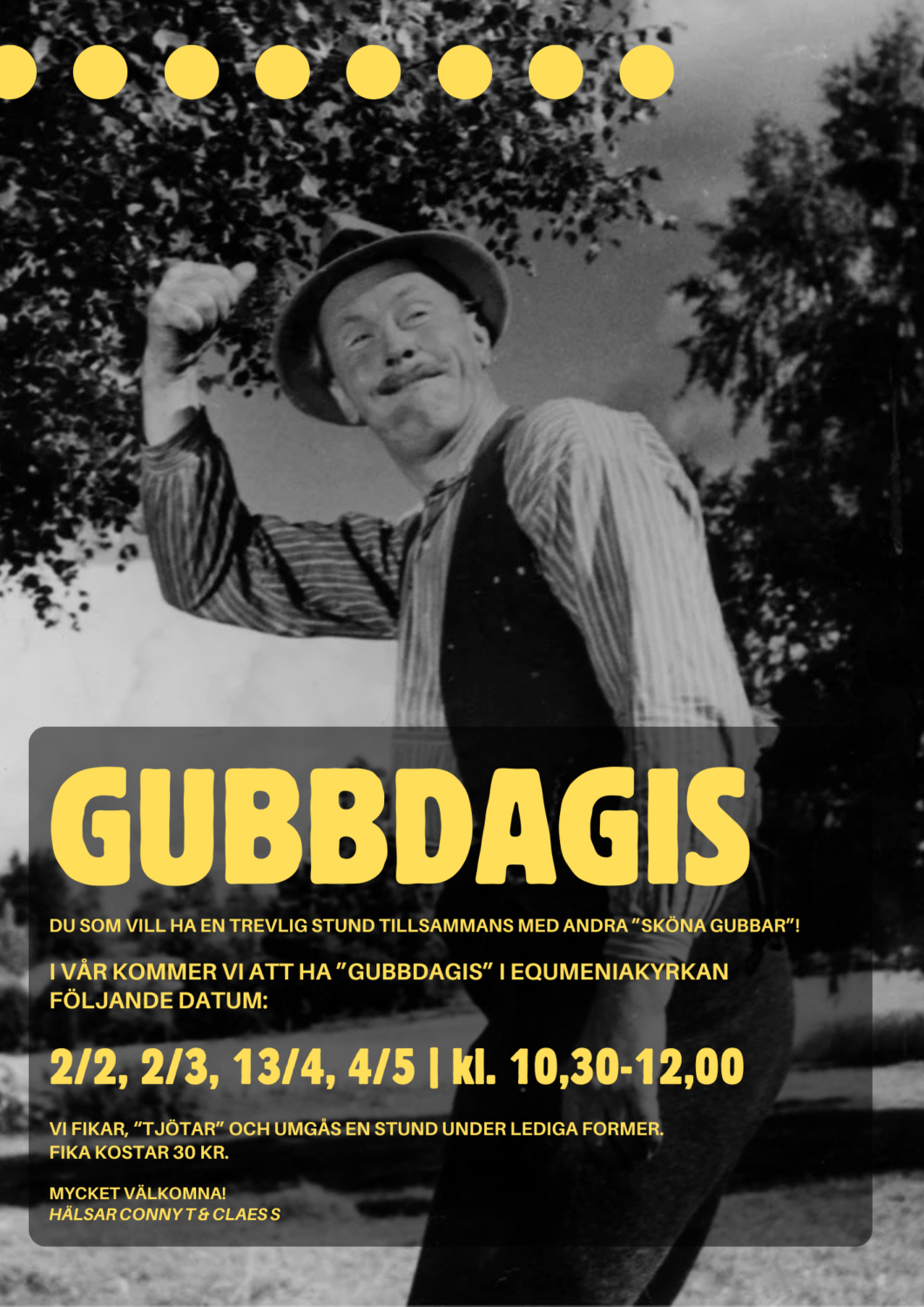 Vill du ha en trevlig stund tillsammans med andra ”sköna gubbar” är du välkommen till Equmeniakyrkan 2/2, 2/3, 13/4 och 4/5 kl 10:30-12:00