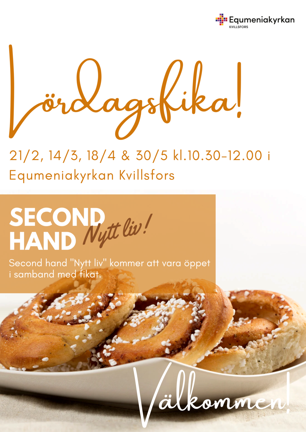 Välkommen till lördagsfika och gemenskap. Första tillfället den här terminen är den 21/2 kl 10.30-12.00. Second hand Nytt liv! har öppet!