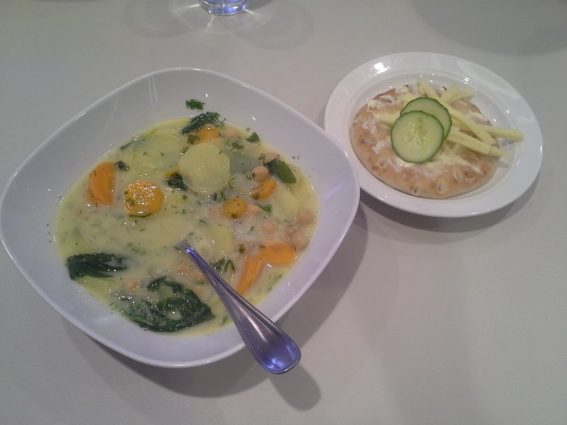 Idag serverades dill och potatissoppa med spenat och kikärter. Och vi invigde våra nya sopptallrikar. Till kaffet hade vi banankaka. Varje vecka serverar vi vegetarisk soppa, mackor och något sött till kaffet.
