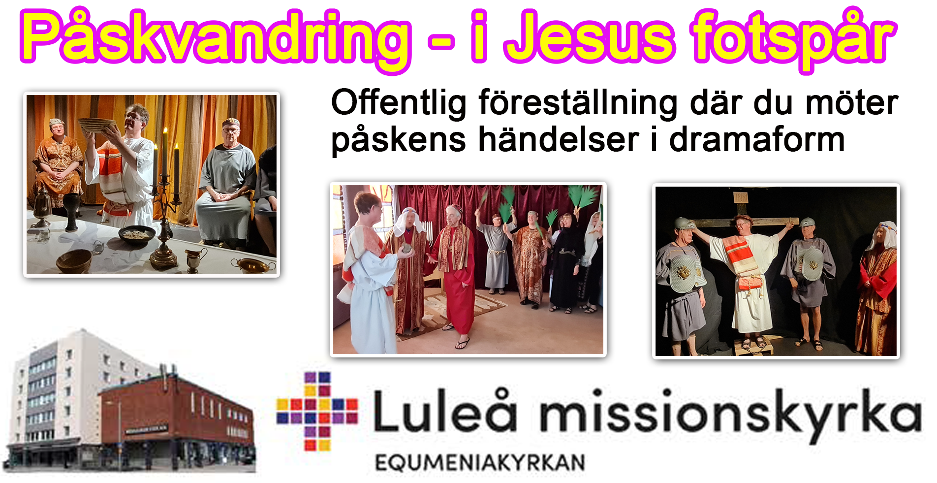 ![]() ![]() Följ med Jesus och lärjungarna från intåget i Jerusalem till den tomma graven! Välkommen att se den föreställning som 10.000-tals skolbarn redan har sett! Vi följer händelser som utspelade sig påsken för ca 2000 år sedan. Onsdag 25 mars kl. 18.00-19.30 Gratis entré: Max 40 deltagare. Anmälan för garanterad plats på: paskvandring@gmail.com |