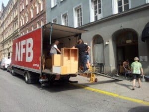 Ett antal frivilliga samlades på morgonen i Gummessons bokhandels gamla lokaler, där alla möbler var samlade. I tre omgångar fick man fylla en lastbil med skrivbord, bokhyllor, stolar och annat. I hamnområdet lastade en annan grupp över allting i en stor lastbil, för stor för att kunna åka in i centrala Stockholm och stå vid kansliet. Allting organiserades av Curt Sandström, som hade bra koll på allt som skulle iväg.
