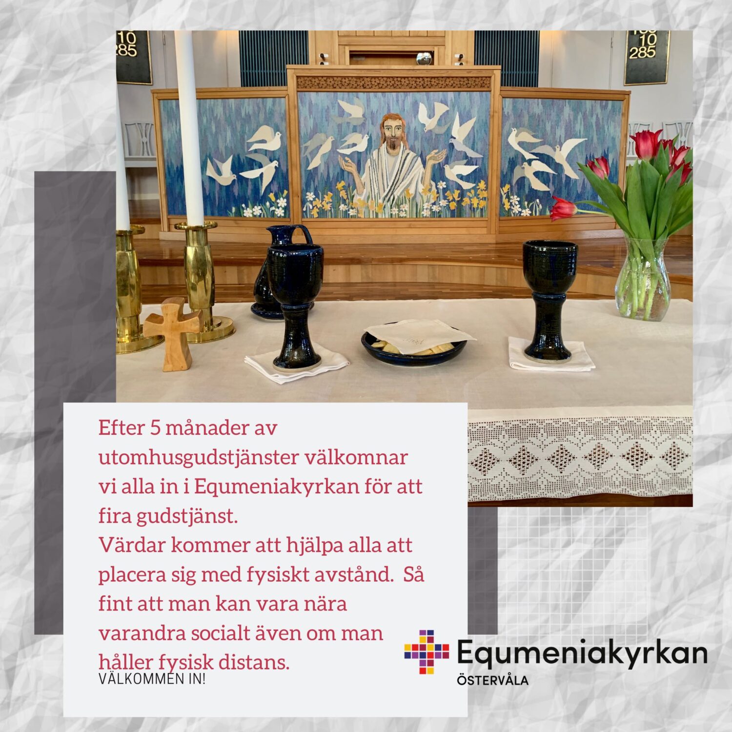 Från och med söndag 4 oktober börjar vi fira gudstjänst inomhus igen. Den gudstjänsten är kl. 18. Följande söndagar firar vi gudstjänst kl. 11. Se kalendern.