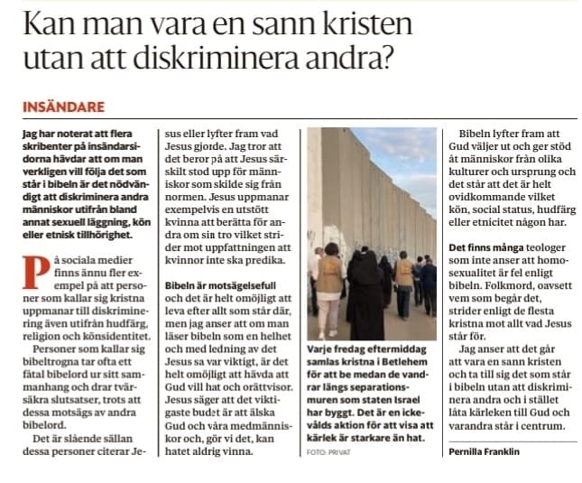 Jag skrev en insändare precis innan jag reste och den handlar om att vi ska låta kärleken till våra medmänniskor styra våra val. Jag tänker att det är vad Jesus vill säga oss även i texterna för söndagen den här veckan. Evangelietexten från Matteusevangeliet 18:7-10 handlar om att Jesus säger att vi ska se upp med sådant som tar oss bort från kärlekens väg och att vi särskilt ska värna om barnen. Jag tänker att det kan innebära att motverka orättvisa strukturer som ökar barns utsatthet. I vårt dagliga liv kan det handla exempelvis om att inte investera våra pensionspengar i företag som upprätthåller dessa strukturer och att handla rättvisemärkta produkter. Detta medför troligtvis att vi får lägre avkastning och högre kostnader, men det är detta Jesus uppmanar oss till. Jag är stolt över att arbeta för Equmeniakyrkan vars vision är att se till hela människan i hela vår värld.