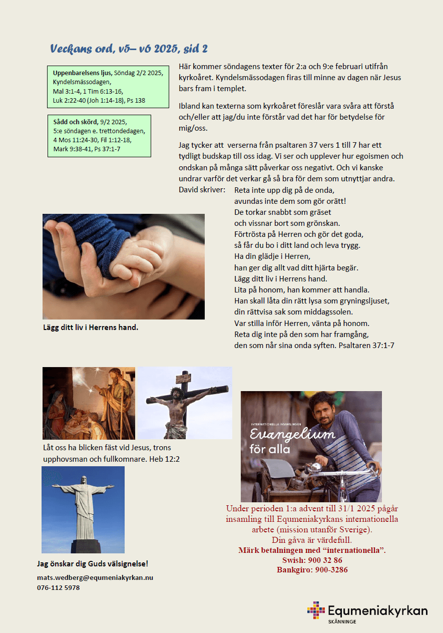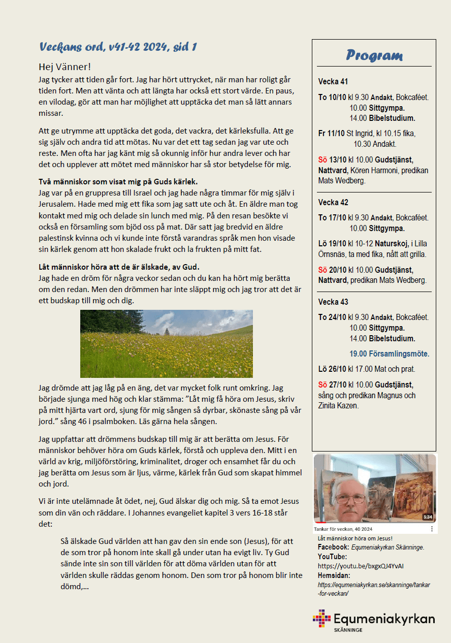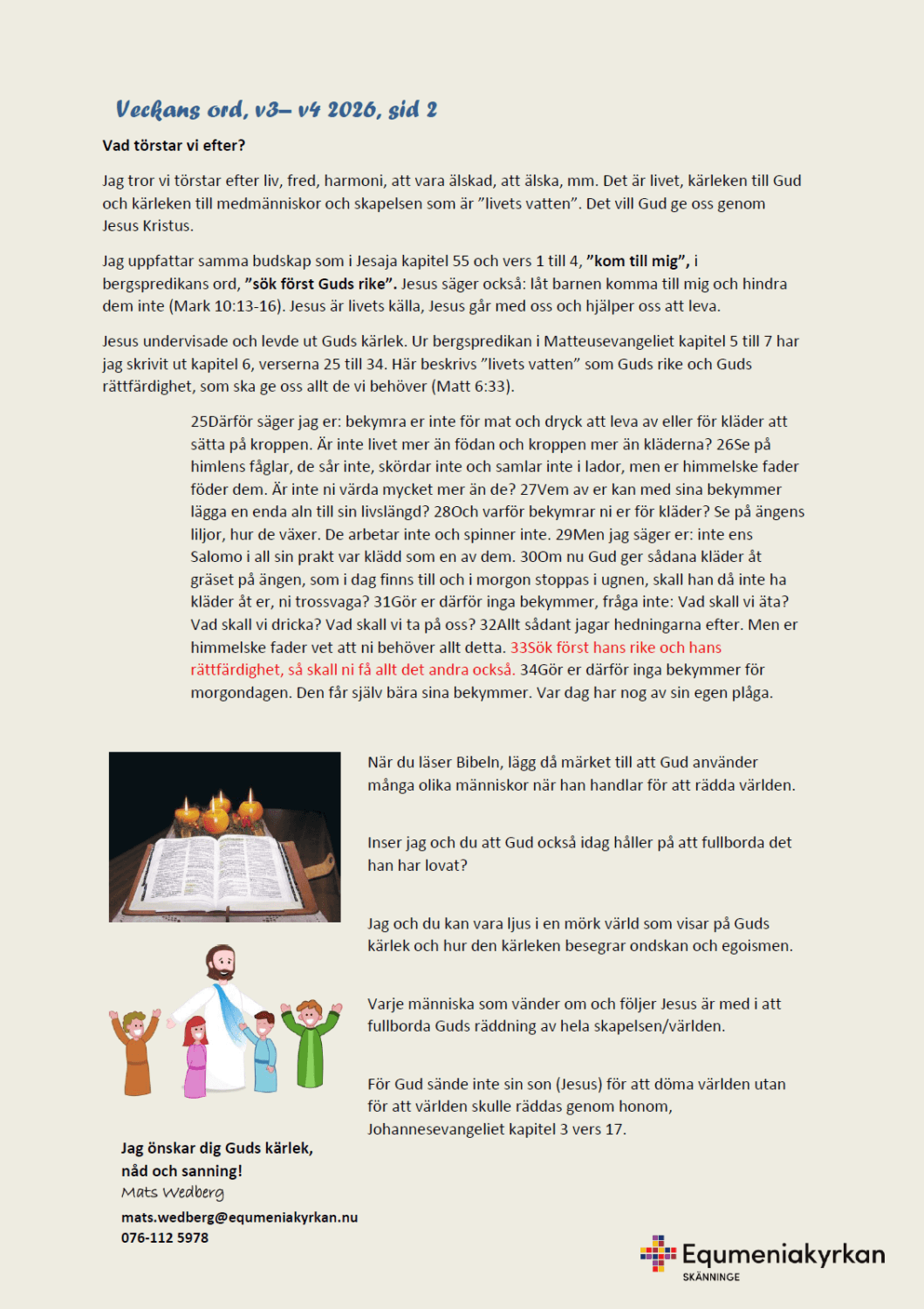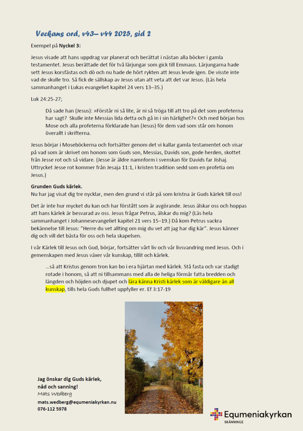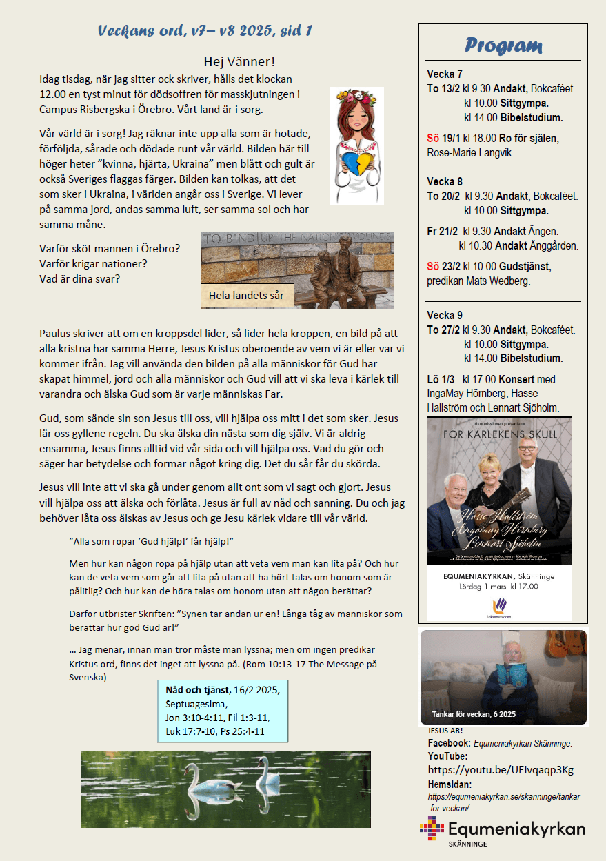 Här finns korta, inspirerande bibelstudier. Du får läsa kyrkoårets texter. Du får tankar, utmaningar och erfarenheter. Läs ”Veckans Ord” ensam eller tillsammans med någon/några. Jesus visar dig och mig kärlekens väg! I ljuset av Jesu kärlek får vi nåd att möta människor, ondska, hat, naturkatastrofer och se framtid och hopp!