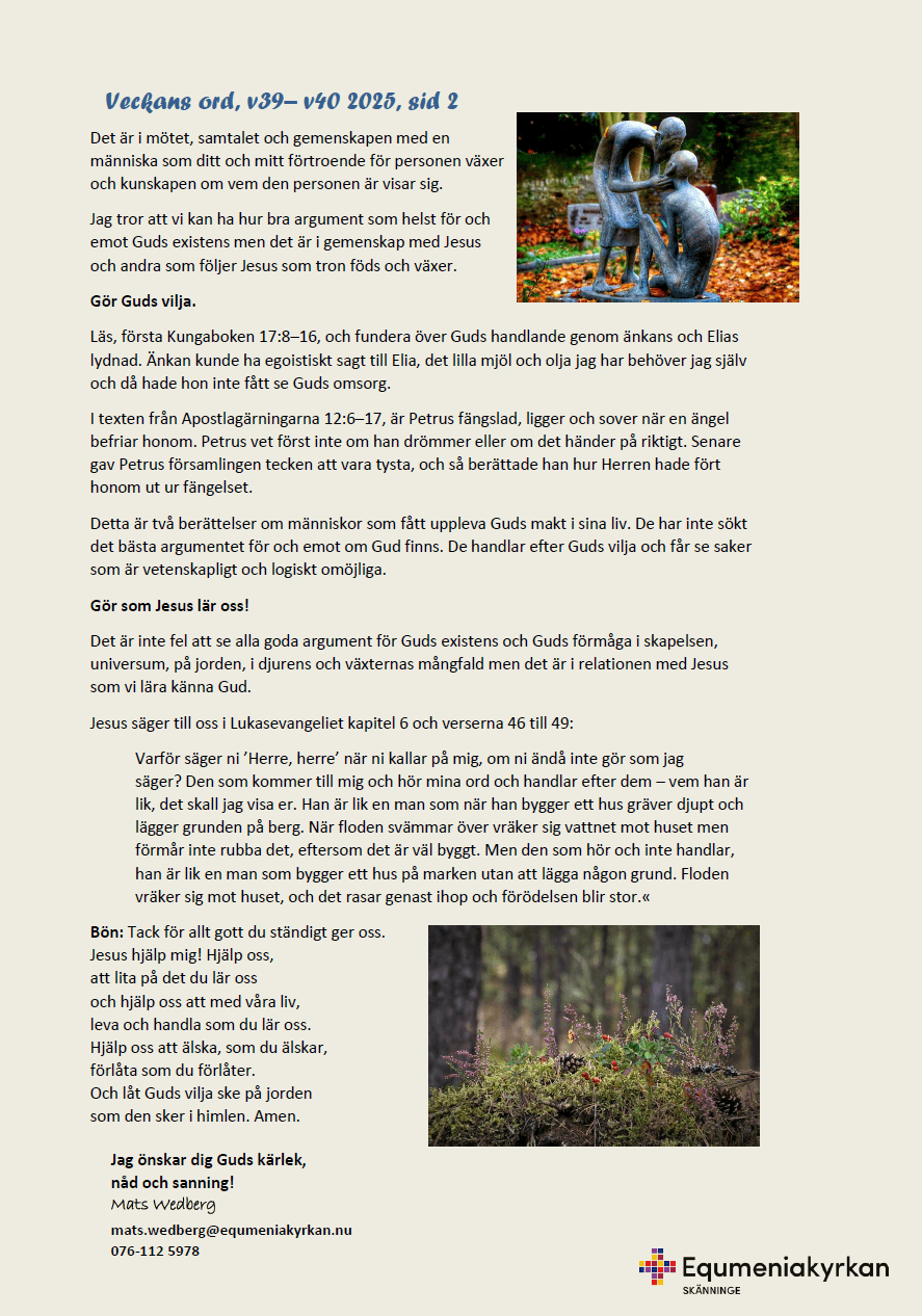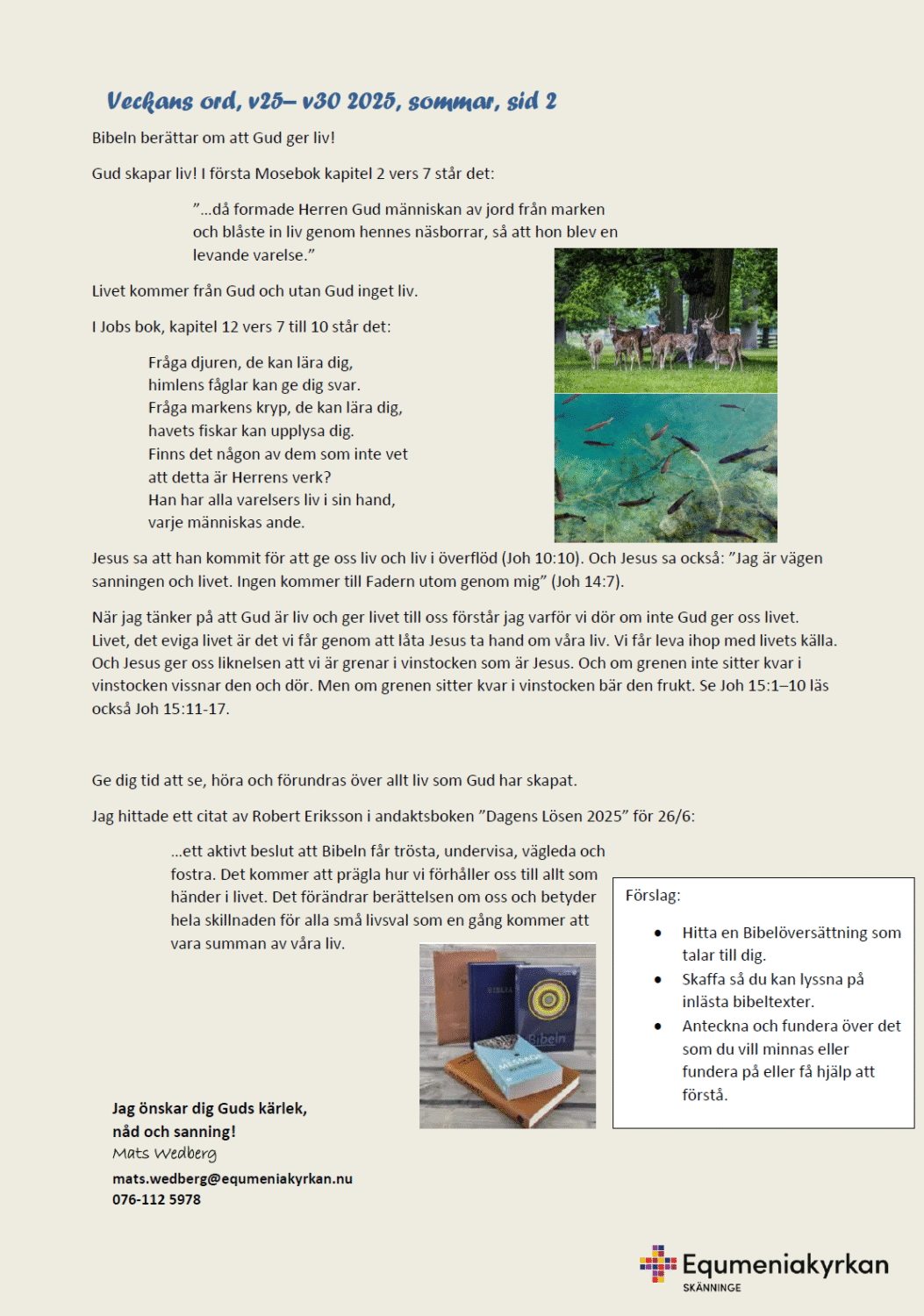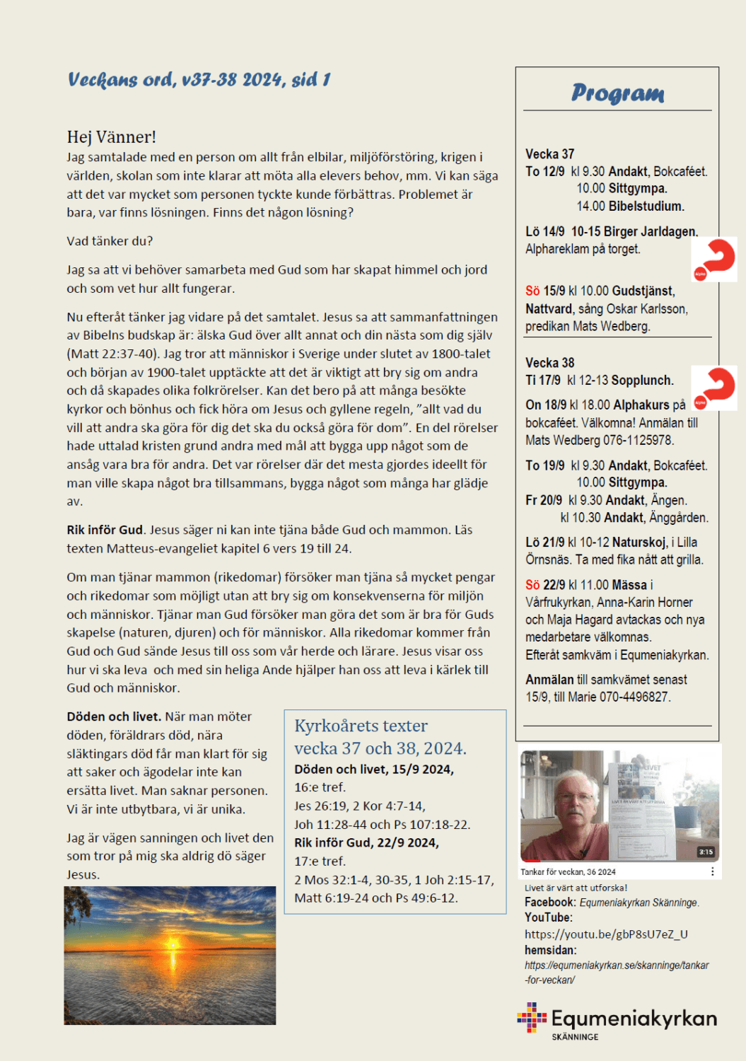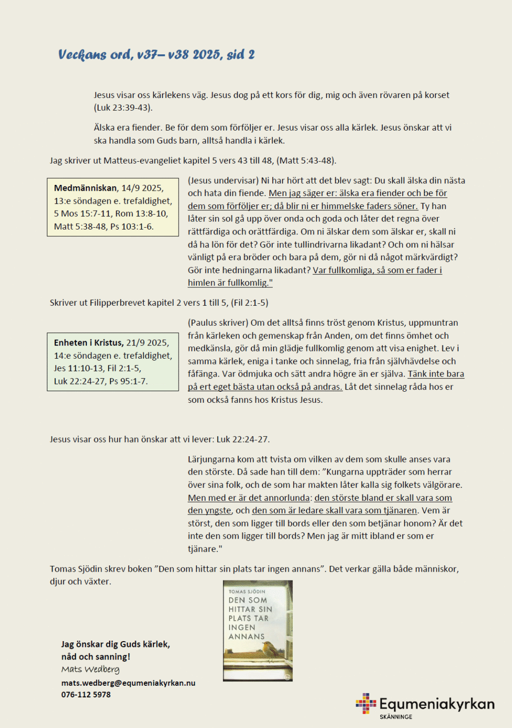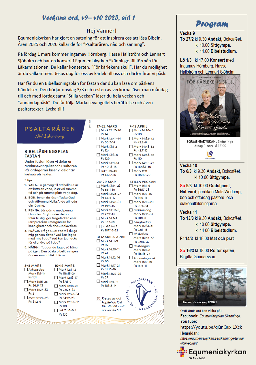 Här finns korta, inspirerande bibelstudier. Du får läsa kyrkoårets texter. Du får tankar, utmaningar och erfarenheter. Läs ”Veckans Ord” ensam eller tillsammans med någon/några. Jesus visar dig och mig kärlekens väg! I ljuset av Jesu kärlek får vi nåd att möta människor, ondska, hat, naturkatastrofer och se framtid och hopp!
