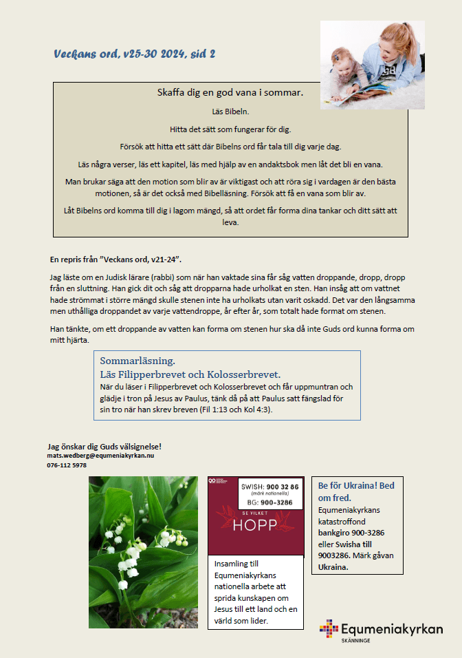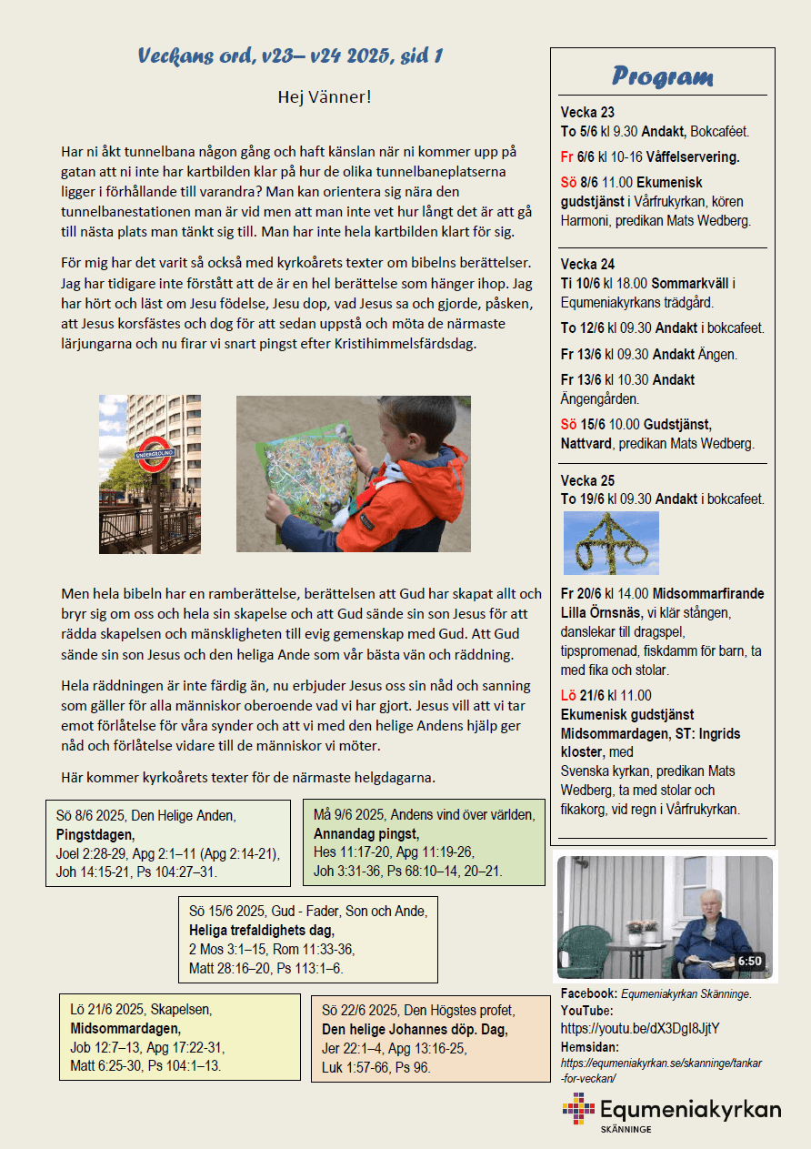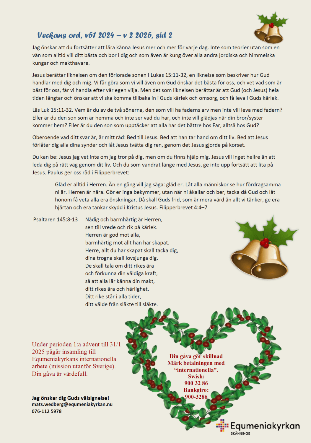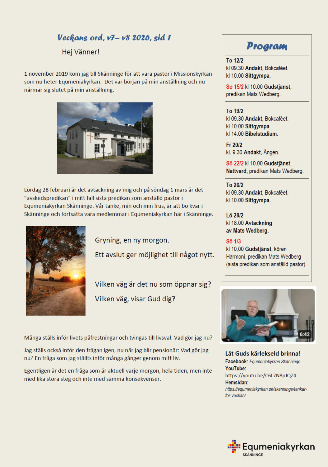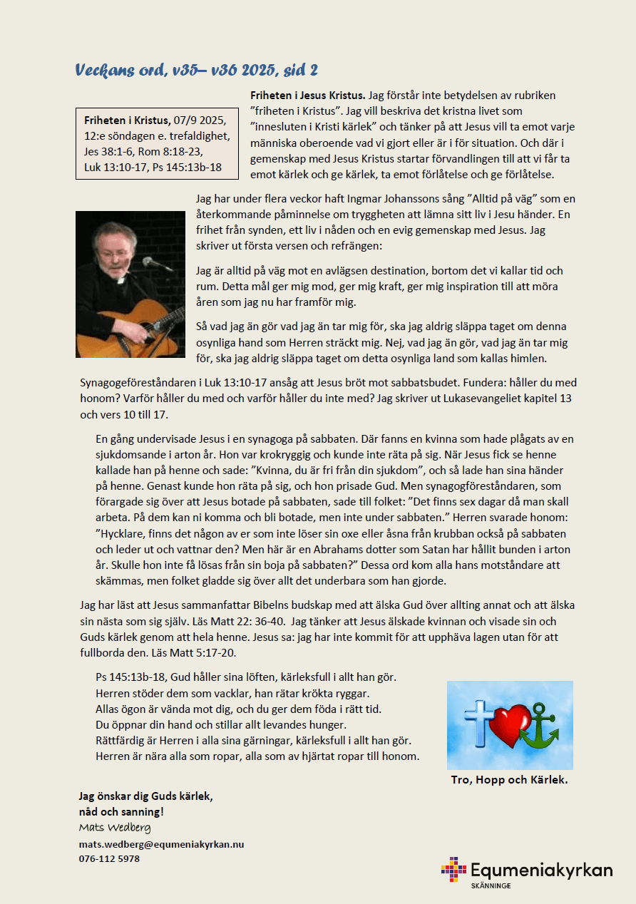 Här finns korta, inspirerande bibelstudier. Du får läsa kyrkoårets texter. Du får tankar, utmaningar och erfarenheter. Läs ”Veckans Ord” ensam eller tillsammans med någon/några. Jesus visar dig och mig kärlekens väg! I ljuset av Jesu kärlek får vi nåd att möta människor, ondska, hat, naturkatastrofer och se framtid och hopp!
