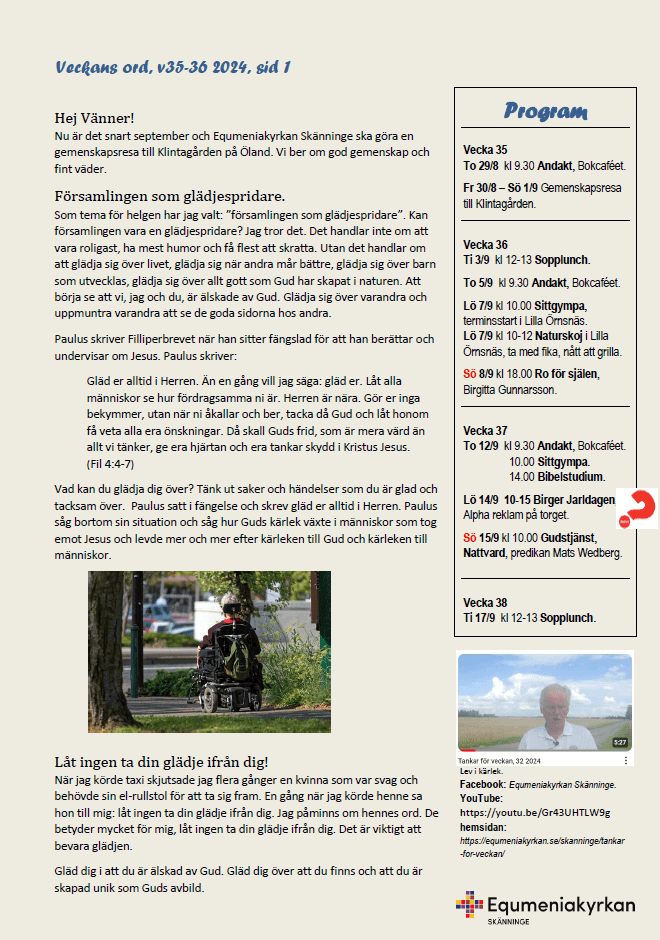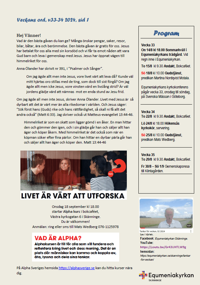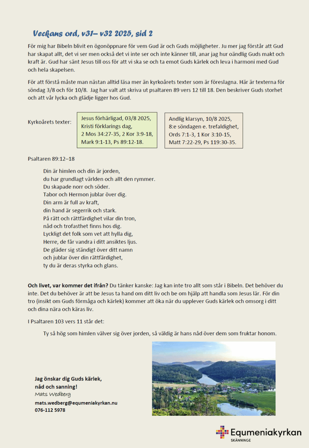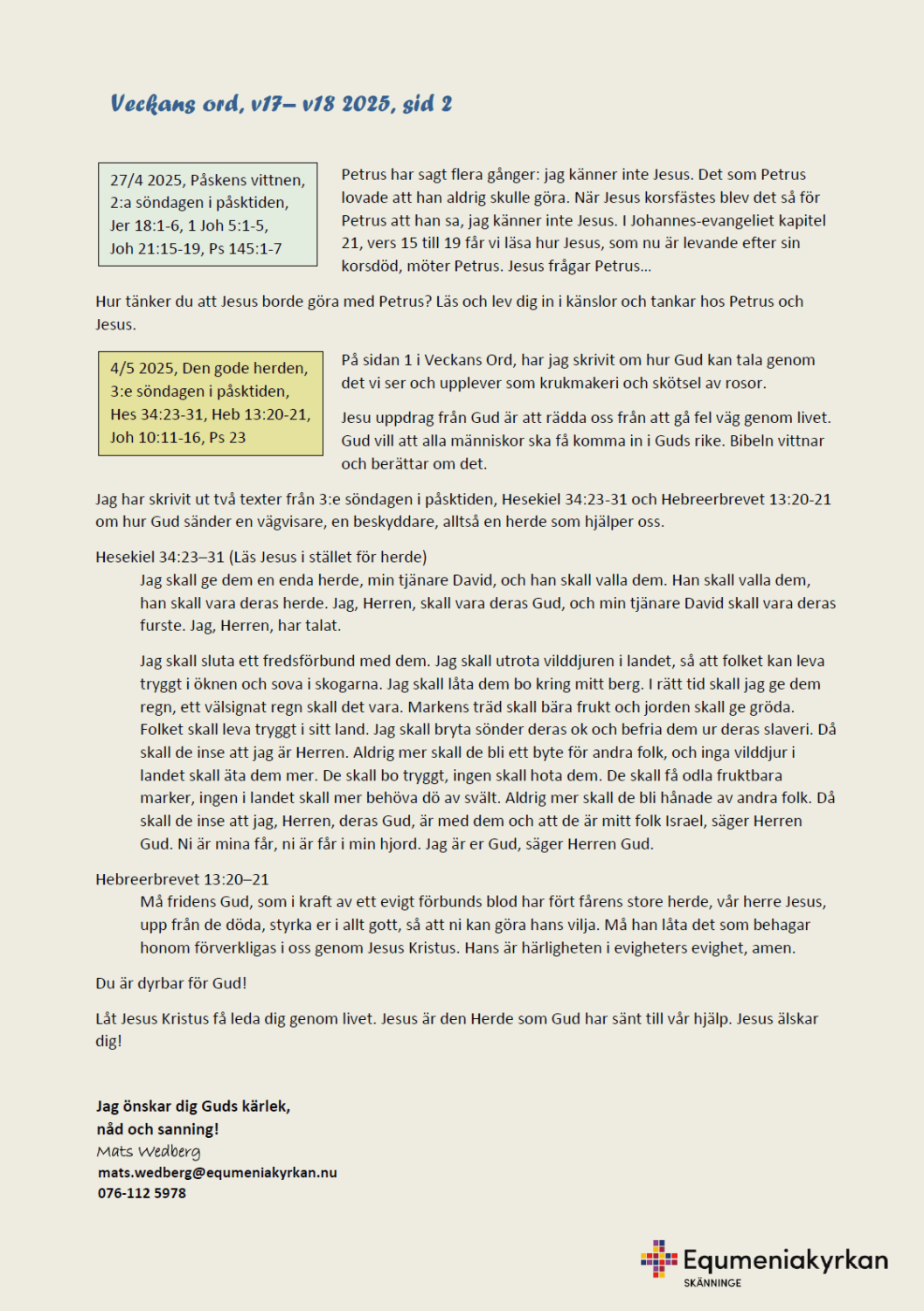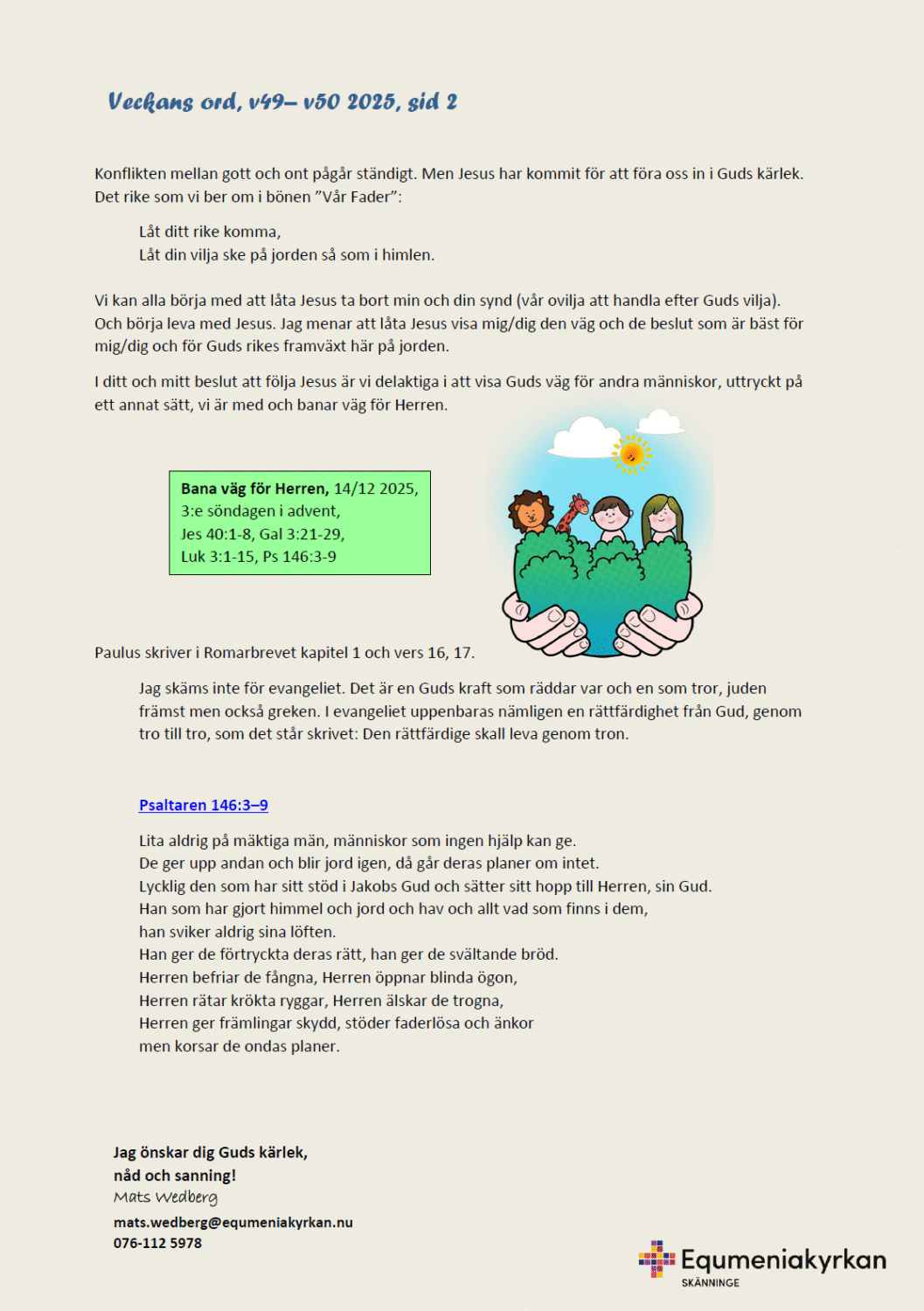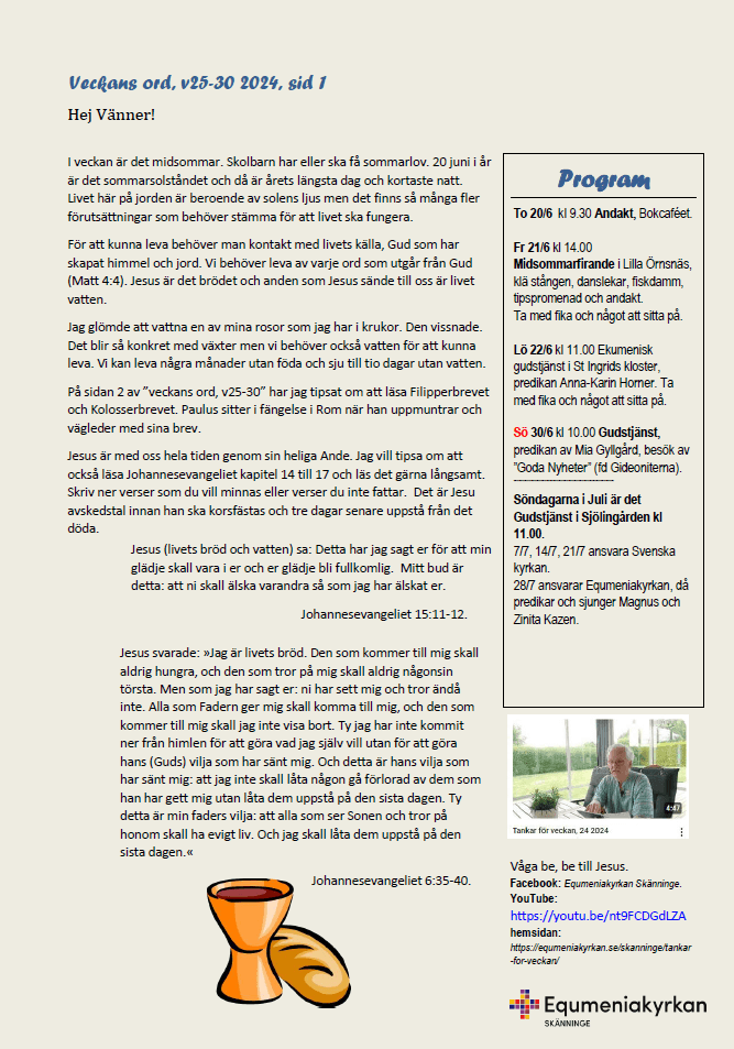 Här finns korta, inspirerande bibelstudier. Du får läsa kyrkoårets texter. Du får tankar, utmaningar och erfarenheter. Läs ”Veckans Ord” ensam eller tillsammans med någon/några. Jesus visar dig och mig kärlekens väg! I ljuset av Jesu kärlek får vi nåd att möta människor, ondska, hat, naturkatastrofer och se framtid och hopp!
