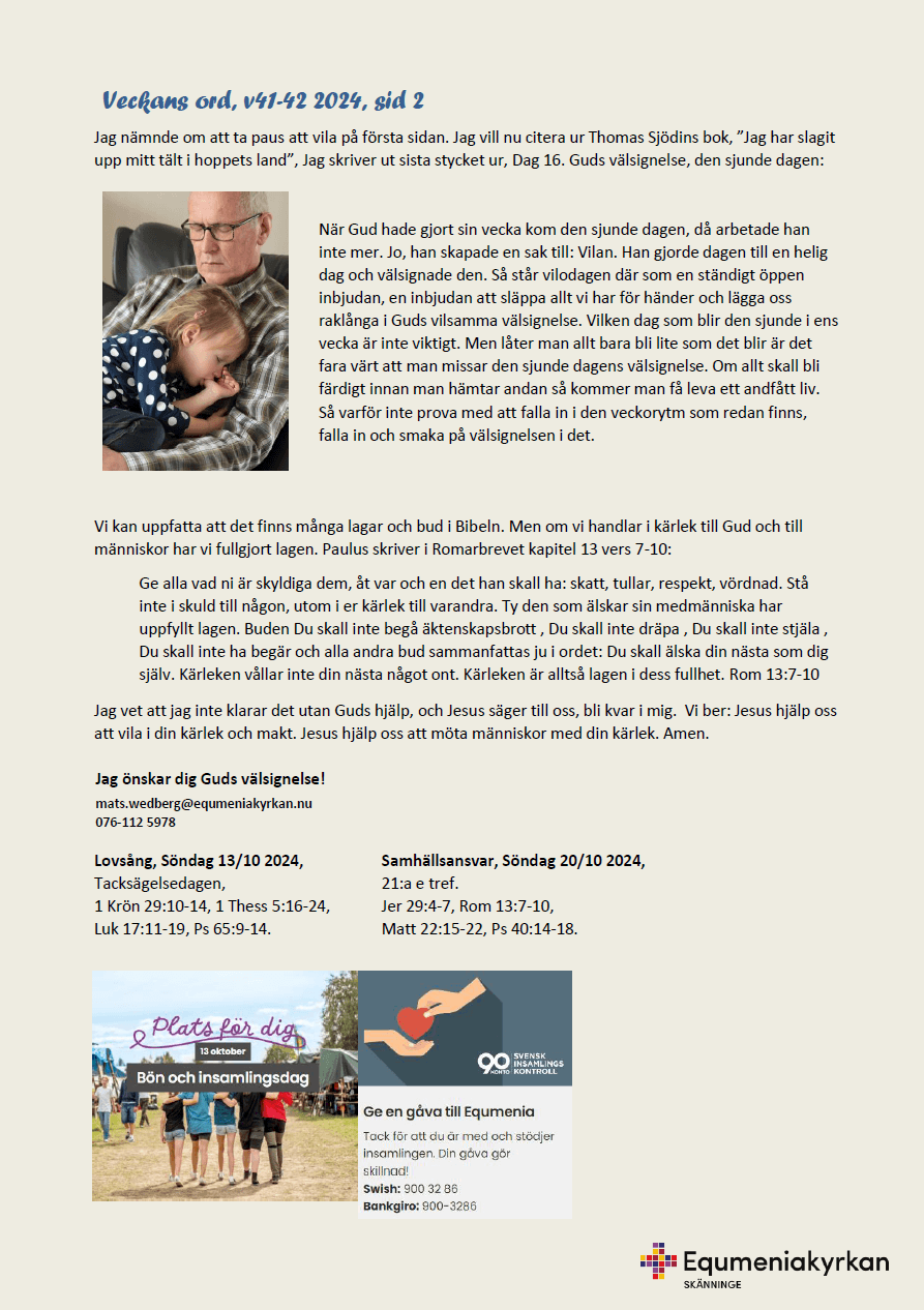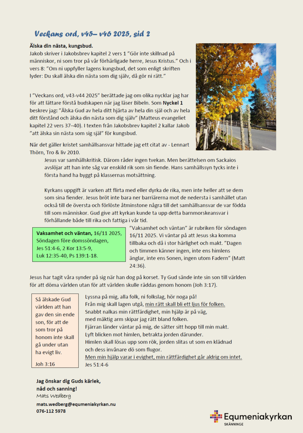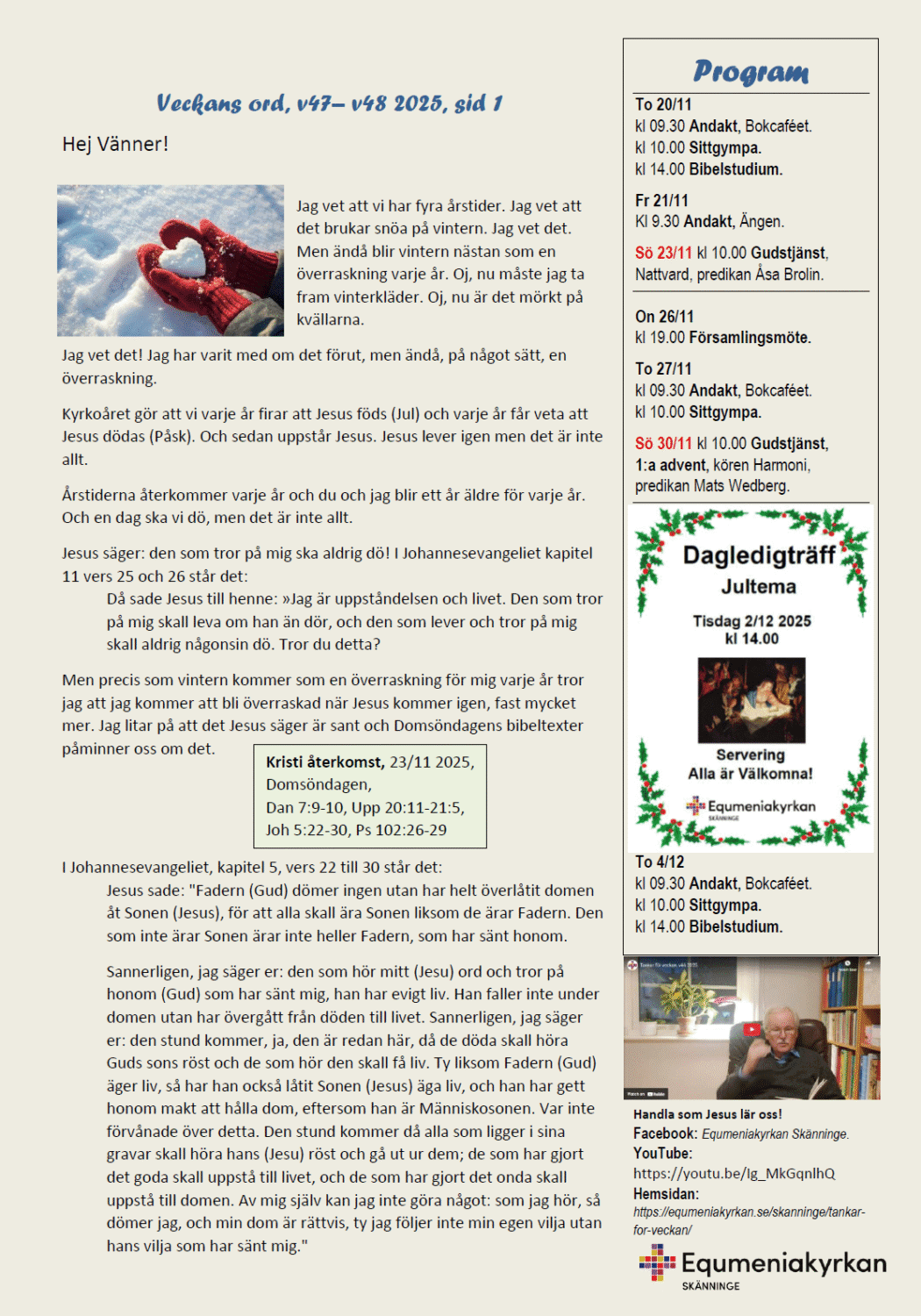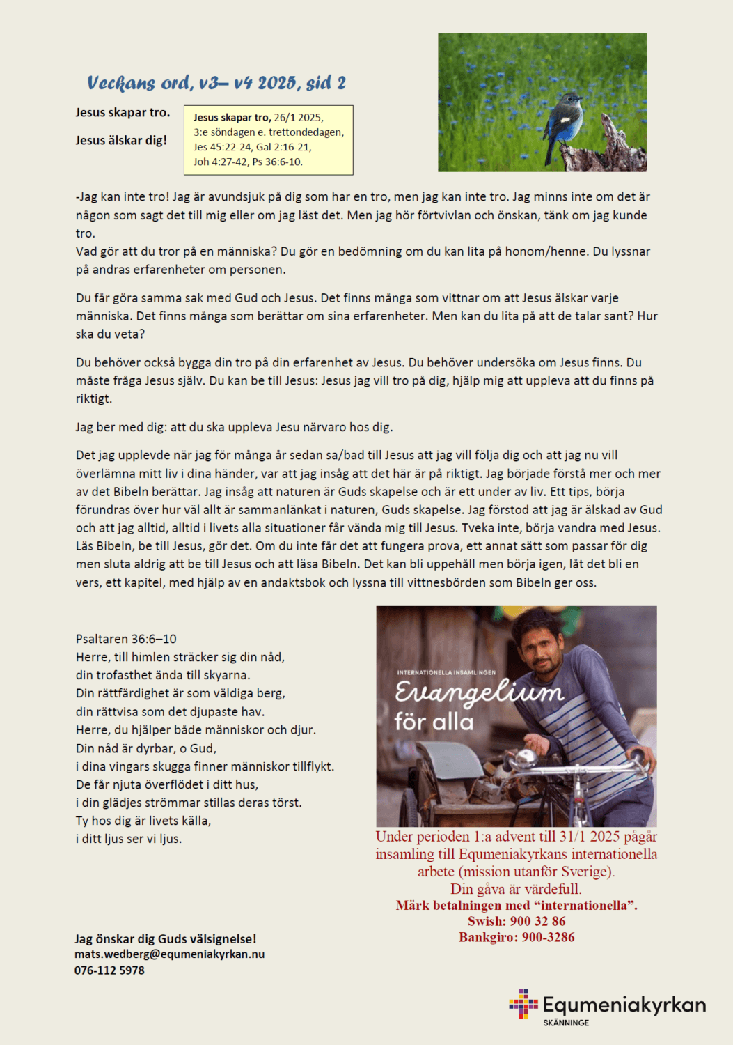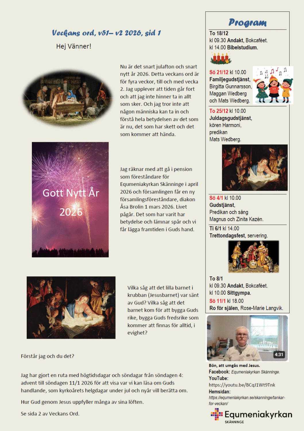 Här finns korta, inspirerande bibelstudier. Du får läsa kyrkoårets texter. Du får tankar, utmaningar och erfarenheter. Läs ”Veckans Ord” ensam eller tillsammans med någon/några. Jesus visar dig och mig kärlekens väg! I ljuset av Jesu kärlek får vi nåd att möta människor, ondska, hat, naturkatastrofer och se framtid och hopp!