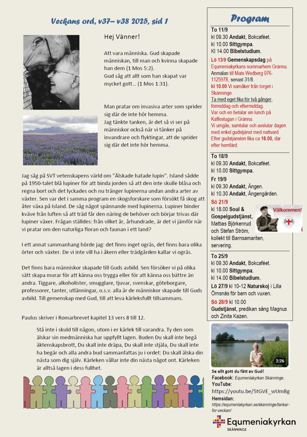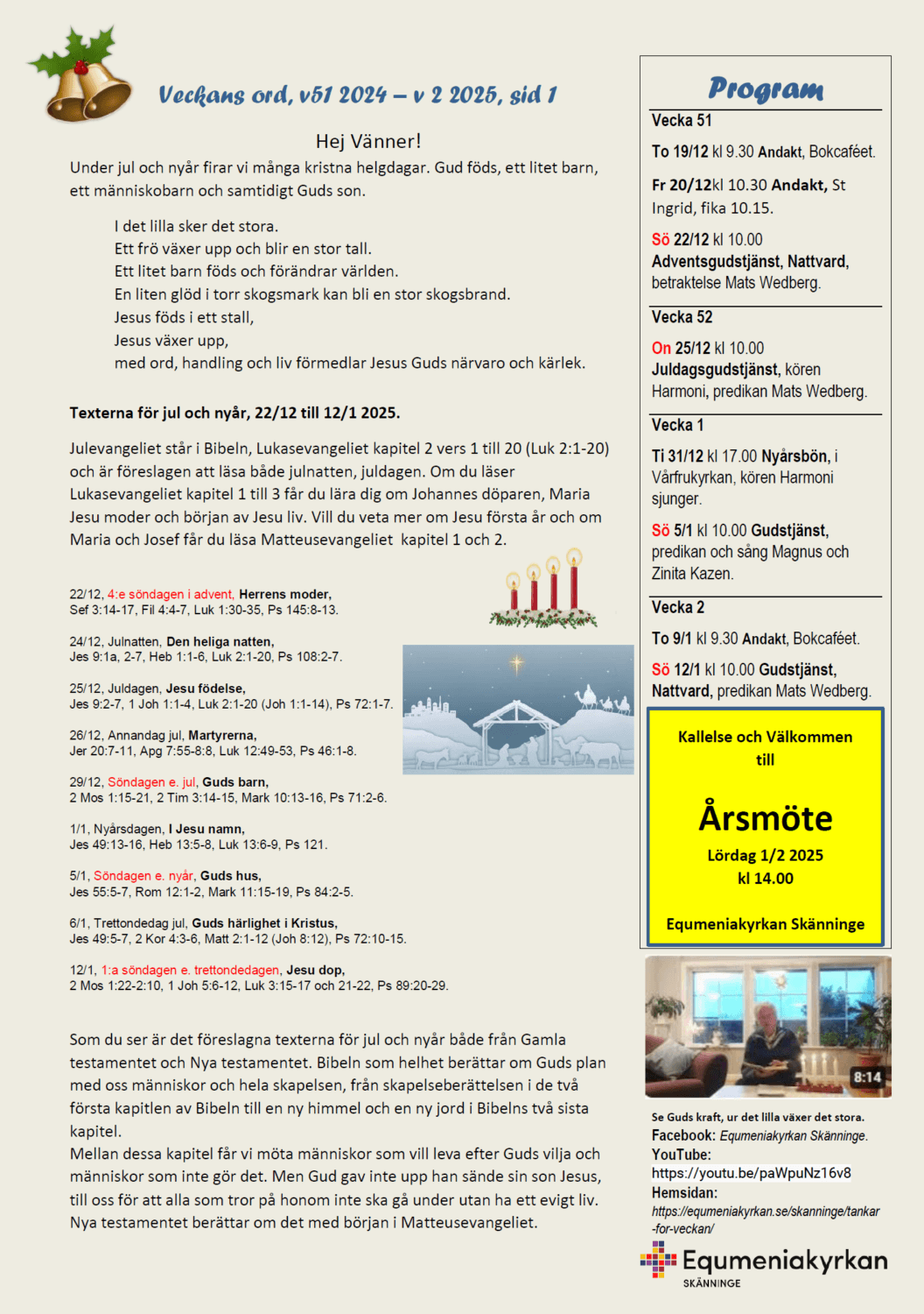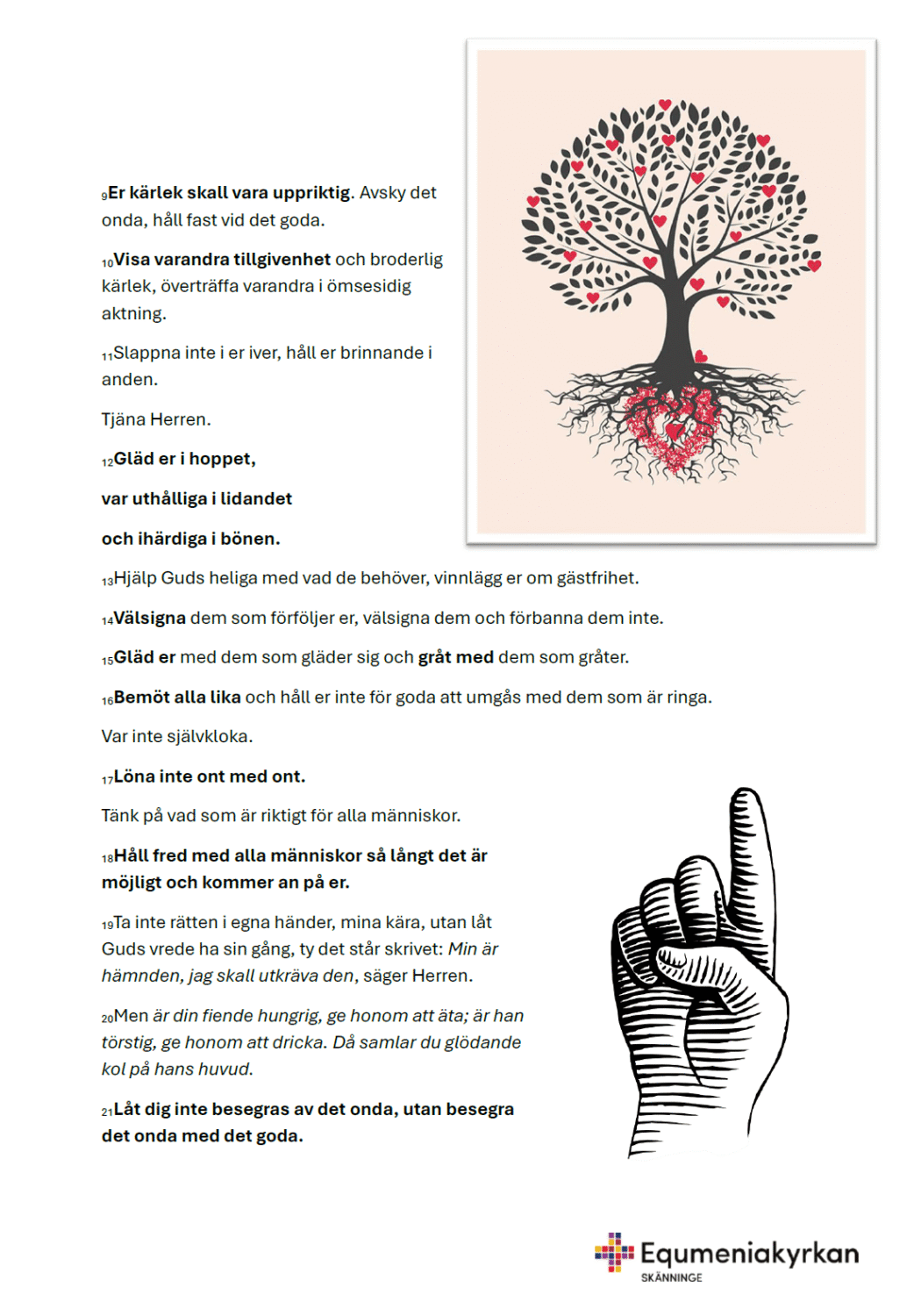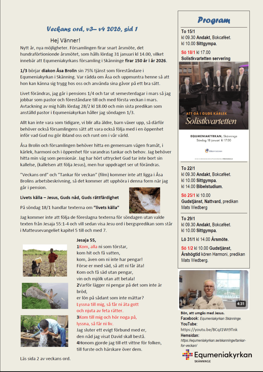 Här finns korta, inspirerande bibelstudier. Du får läsa kyrkoårets texter. Du får tankar, utmaningar och erfarenheter. Läs ”Veckans Ord” ensam eller tillsammans med någon/några. Jesus visar dig och mig kärlekens väg! I ljuset av Jesu kärlek får vi nåd att möta människor, ondska, hat, naturkatastrofer och se framtid och hopp!