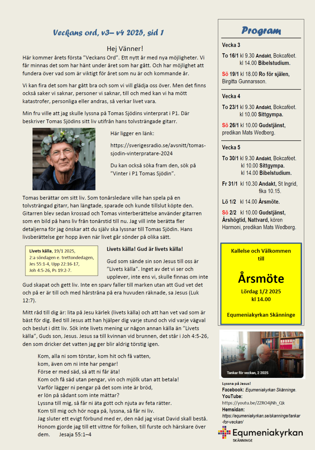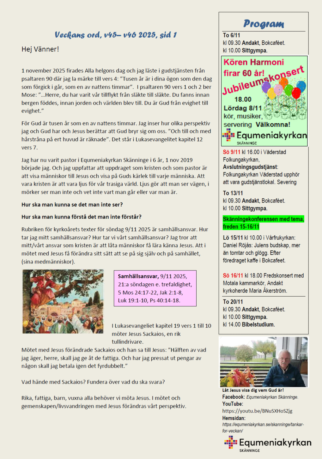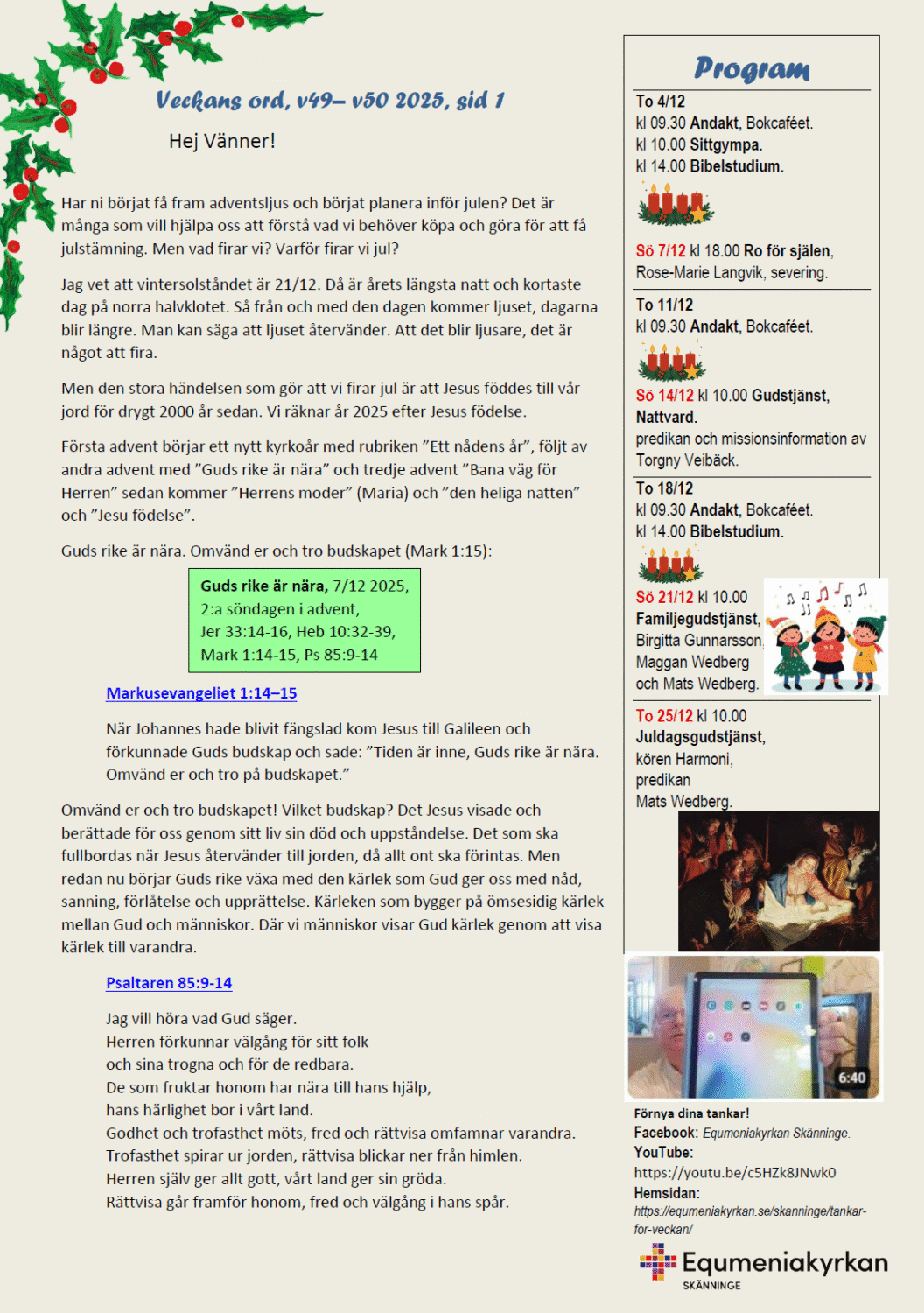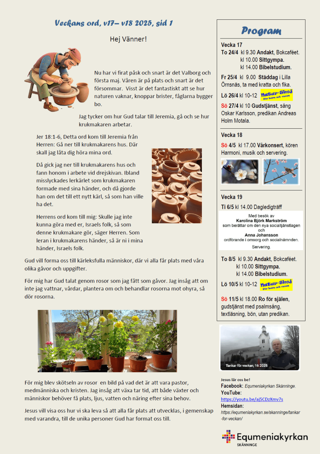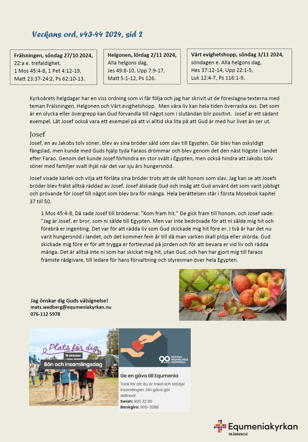 Här finns korta, inspirerande bibelstudier. Du får läsa kyrkoårets texter. Du får tankar, utmaningar och erfarenheter. Läs ”Veckans Ord” ensam eller tillsammans med någon/några. Jesus visar dig och mig kärlekens väg! I ljuset av Jesu kärlek får vi nåd att möta människor, ondska, hat, naturkatastrofer och se framtid och hopp!