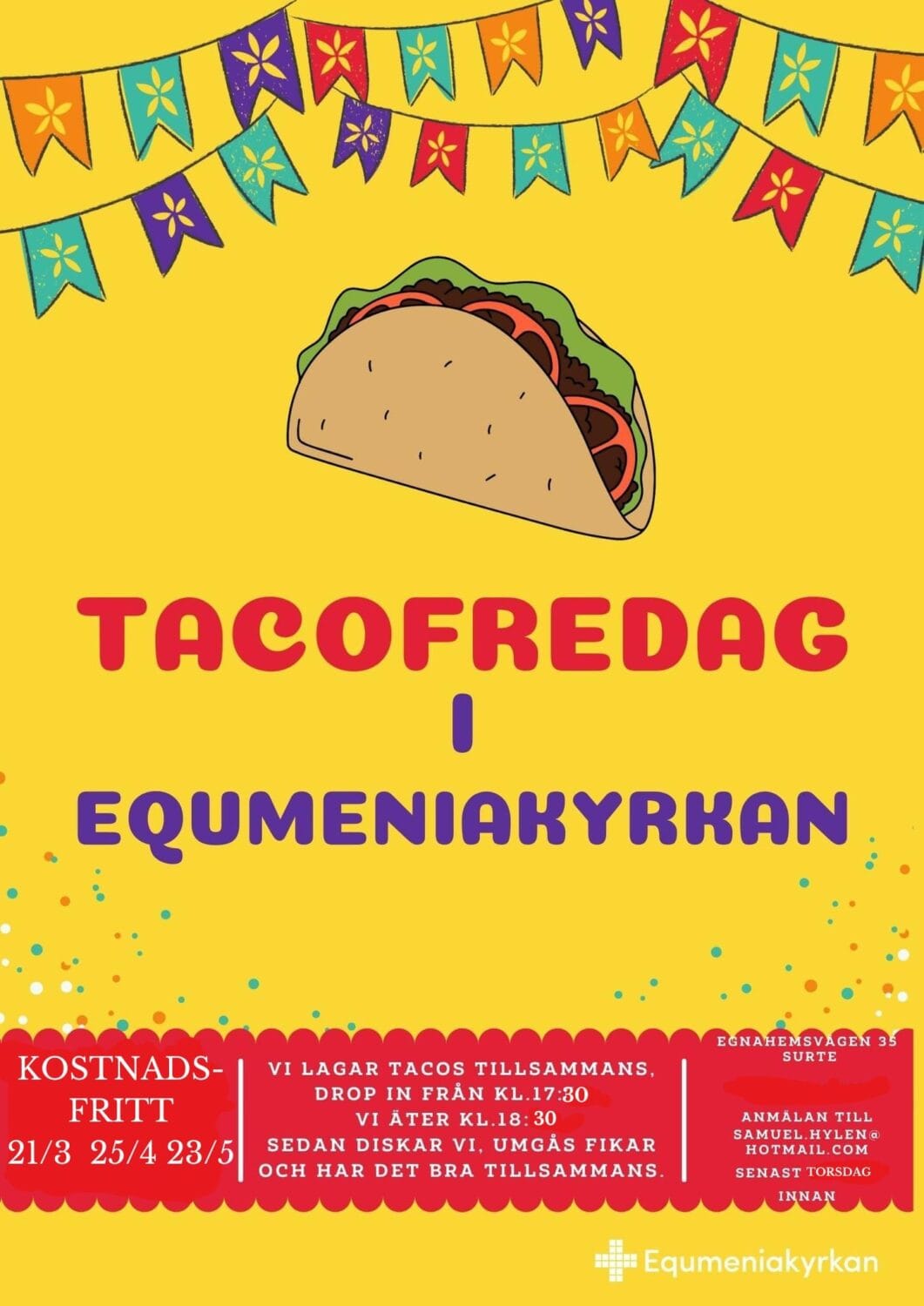 En fredagskväll i månaden träffas vi och äter tacos tillsammans! Dörrarna står öppna från kl 17:00. Vi lagar maten tillsammans, har en kort samling och äter sedan ca kl 18:00. Därefter spelar vi spel, umgås, pratar och leker. Inga förkunskaper eller erfarenheter krävs utan alla är varmt välkomna!