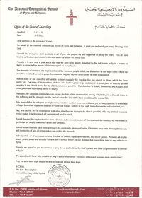 Gemensam Framtid har fått ett brev från Nationella Evangeliska Synoden i Syrien och Libanon, som sedan många år är en av våra systerkyrkor.