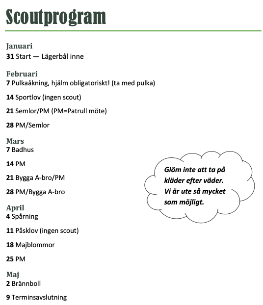 Nu är terminen planerad och den är fylld med lekar, semlor, utmaningar och massa annat skoj.