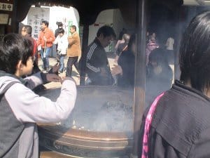 Idag besökte vi gamla stan i Tokyo (Asakusa) med körsbärsträden som håller på att slå ut, mängder av stånd och det ståtliga Buddisttemplet (ovan höger) där folk viftade i sig den heliga, och enligt traditionen, renande rökelsen ( nedan till vänster) och tvättade händerna i renande vatten.