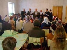 Bilder: Vanlig bebyggelse i Ukraina. Gudstjänstfirande i ukrainsk baptistförsamling.
