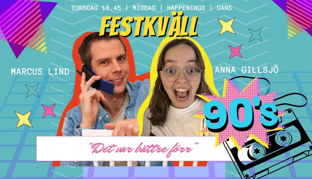 På torsdag kväll är det Festkväll med middag och 90-talsvibbar – en kväll full av nostalgi för vissa och exotiskt retro för andra. Det blir tävlingar med bekanta moment, skratt och throwbacks. Det var bättre förr… eller? Avgör själv!